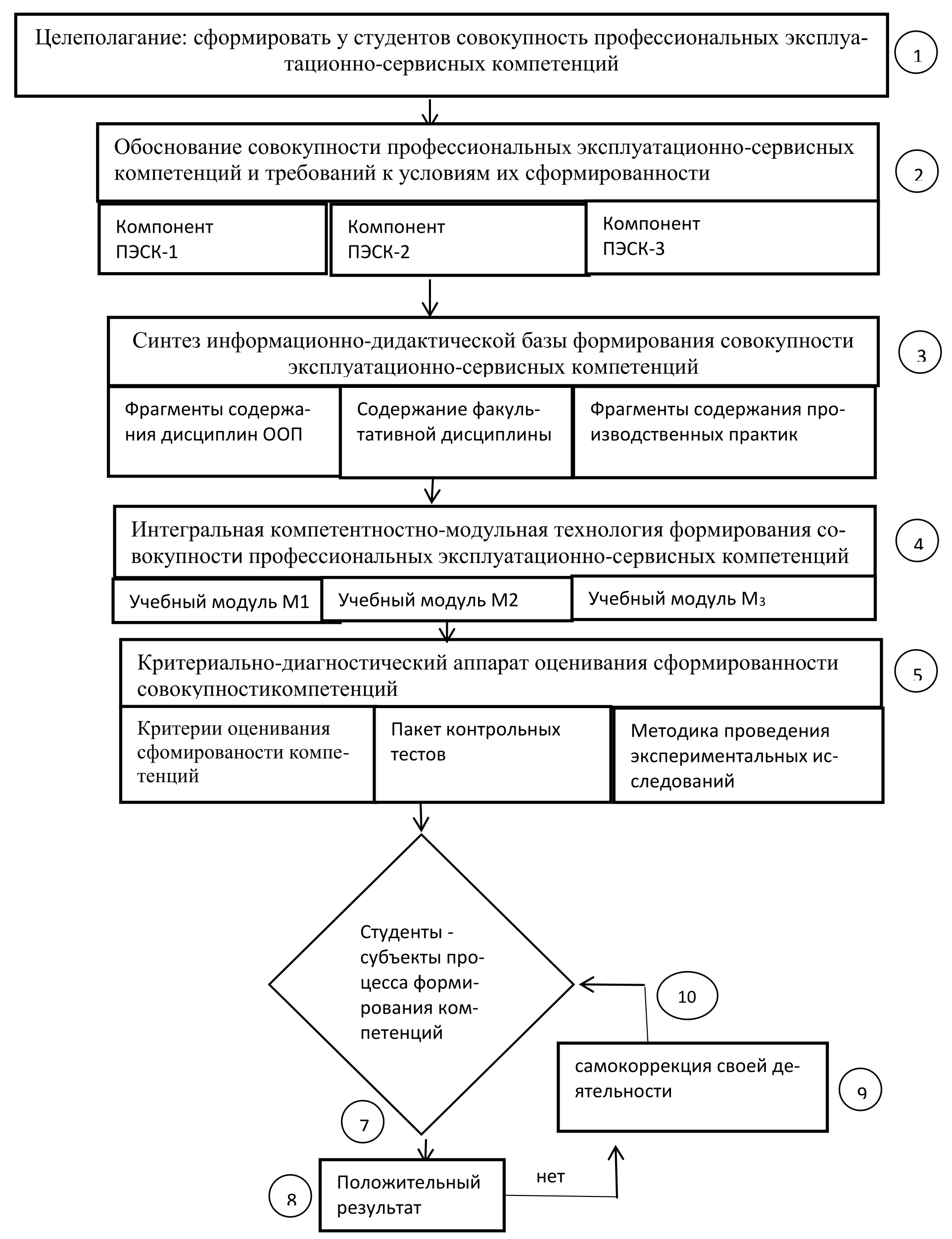 Центральным звеном структурно-функциональной модели формирования у студентов железнодорожного техникума совокупности профессиональных эксплуатационно-сервисных компетенций является звено 4 – «Интегративная компетентностно-модульная технология формирования у студентов профессиональных эксплуатационно-сервисных компетенций». В самом общем виде педагогическая технология формирования компетенций представляет собой некий конечный ряд мыследеятельностных, аудиальных, визуальных, мануальных операций и процедур по преобразованию ранее освоенных знаний/информационно-дидактической базы в соответствующие имманентные ими виды учебно-познавательной и профессиональной деятельности в компетенции. В рассматриваемом нами конкретной ситуации целостная педагогическая технология кардинально переструктурирована и расчленена на три условно-локальных учебных модуля М1, М2 и М3, в которых формируются соответствующие компоненты совокупности профессиональных эксплуатационно-сервисных компетенций ПЭСК-1, ПЭСК-2 и ПЭСК-3. Ранее проведенные исследования говорят об эффективности целенаправленного формирования профессиональных компетенций у студентов технических специальностей при дальнейшей адаптации на производстве [13].