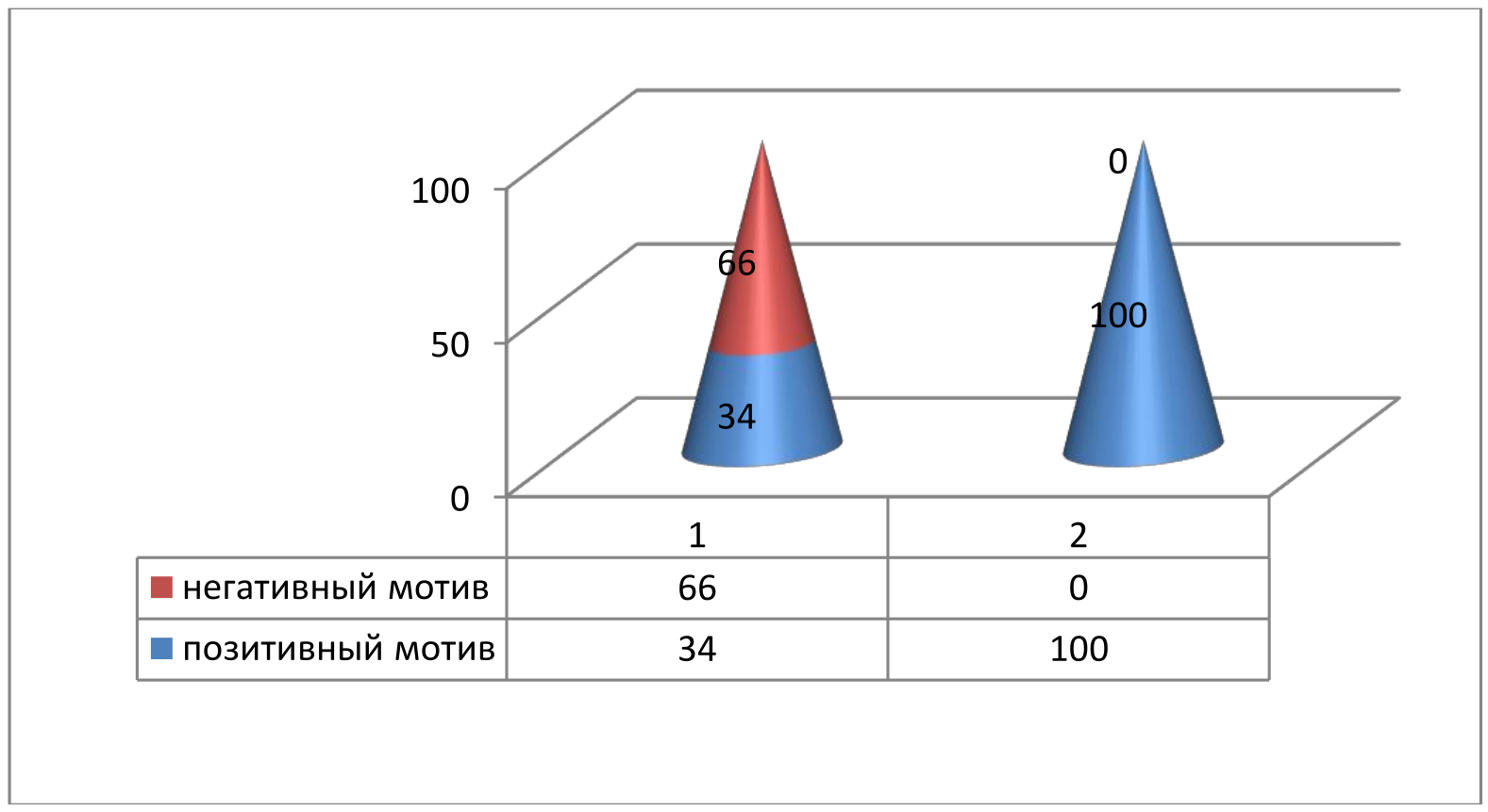 В экспериментальной группе (ЭГ 1) – 1 на констатирующем этапе из 66% (21 студент), негативный мотив присутствует (интерпретация, расшифровка предпочитаемых цветных пар по М. Люшеру) у 8 студентов (фиолетовый и голубой) — неопределенное настроение, стремление к согласию и гармонии, чувство неудовлетворенности, стимулирующее к активности; у 6 студентов (фиолетовый и оранжевый) — некоторое возбуждение, увлеченность, активное стремление произвести впечатление, стрессовое состоя из-за неудач в активных, иногда необдуманных действий; у 5 студентов (фиолетовый и зеленый) настороженность, желание произвести впечатление, стрессовые состояния из-за неосуществившегося самоутверждения; у 2 студентов (коричневый и фиолетовый) — чувство неудовлетворенности, стремление к комфорту.