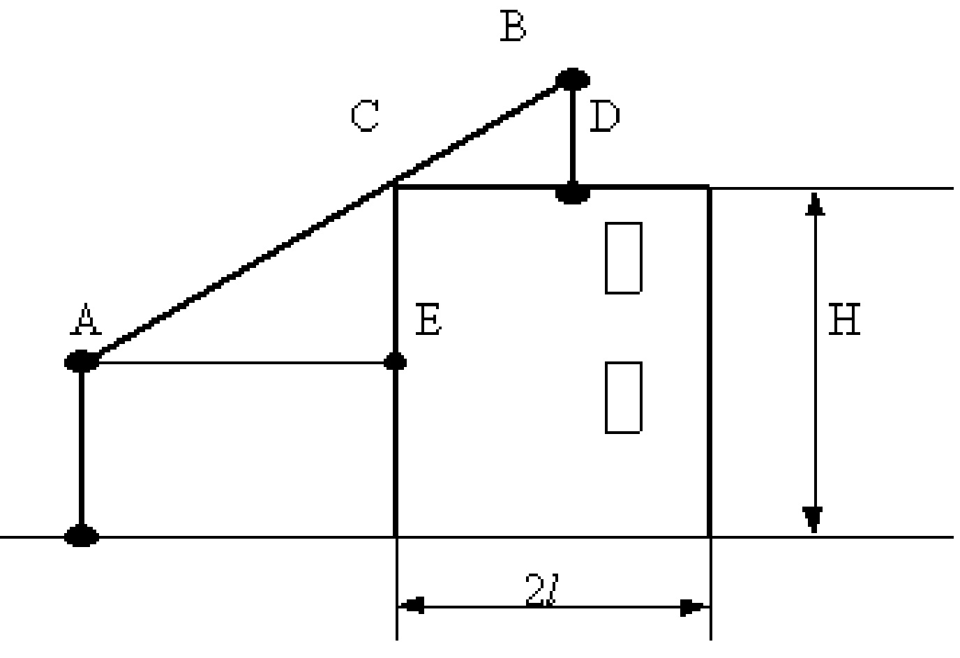 Дачный дом должен иметь высоту H=7 метров, его основание является квадратом площадью 100 м2 Крыша у дома плоская. Автомобильный кран может перемещаться вокруг всего здания, поэтому крюк его крана достанет до любой точки здания, если он достает до центра крыши. Стоимость аренды автомобильного крана зависит от длины его стрела. Поэтому для того, чтобы не переплачивать за аренду, нужно определить место установки крана, который достанет до любой точки крыши с наименьшей диной крана. Обозначьте буквой α величину угла наклона стрелы крана, а ее длину буквой у, высоту подвеса стрелы –буквой h.