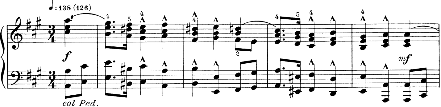 Главный участник важного события так увлечен маршированием, что каждый раз не успевает на сильную долю: разрешения мотивов приходятся каждый раз на вторую слабую долю такта. Центральный эпизод fortissimo, повторенный дважды, очевидно, и есть самое главное в важном событии. Это – «оркестровое» tutti с тяжеловесным и неуклюжим solo низкой «меди». Метроритмическая определенность: сильные доли тактов подчеркнуты опорными длительностями половинных, отмечены тяжелыми акцентами и sforzando; полная устойчивость: сильные доли соответствуют основным функциям в гармонии – все говорит о свершившемся важном событии.