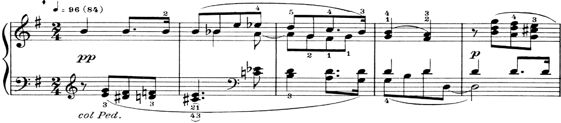 В начале второго предложения в G dur «расстояние» между ними будто становится больше: sfp на месте, а акценты исчезли (тт. 9-12). И вдруг неожиданная уловка – широко расставив «руки» синкопа квинты в басу пытается «поймать» противника (тт. 13-14), синкопа sf доминанты к h moll «подбрасывает» хроматическую гамму (тт. 15-16) и, слегка «поскользнувшись», тема вновь бежит дальше. Пьеса так неожиданно коротка и так быстро заканчивается, так печально повисает последний аккорд си минора, что мы уж и не знаем, что это было: веселая беспечная игра или воспоминание о невозвратимом счастье.