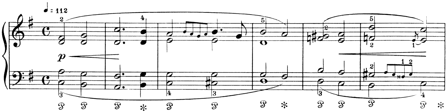 Во второй фразе солируют крайние голоса, остальные сопровождают их уже без хроматических «страхований». Встречаются опять «на том же месте» в точно таком же, как и в первый раз, кадансовом обороте (тт. 5-8). Кто-то еле слышно мелкими шажочками перебегает комнату и тут же бросается обратно. Стремительность и легкость движения создается самыми различными средствами: начиная от обозначения ремаркой Schneller до импульсивной ритмической фигуры мелодии (восьмая, две шестнадцатых, пять восьмых), от емких фраз, объединенных лигами до staccato синкопированных аккордов сопровождения. О предельной легкости бега напоминают ремарки pianissimo и senza Pedal. Поворот в движении отмечен тональным сопоставлением e moll – C dur и подчеркнут акцентом на шестнадцатой длительности аккомпанемента (т. 10). Акцент на залигованной ноте в верхнем голосе говорит о стремлении сделать короткое воображаемое crescendo, заменяет тем самым возможную здесь фермату (т. 12). После бутафорского нагромождения хроматизмов вернувшейся первой темы неожиданно врывается в сумрачную атмосферу «пугания» новый образ: после тихого каданса вдруг forte, sforzando, синкопы и скачки аккордов (тт. 21-24). Или крадущиеся наткнулись на «засаду» или сами подготовили некий фейерверк прыжков и, несомненно, вызвали испуг ничего не подозревающих, как минимум, свой неожиданностью. Испуг и смех, фантазия и игра – все здесь вместе, все неразделимо. Еле уловимыми ностальгическими нотками звучат четыре такта e moll, в которых сворачивается бурная радость темы в G dur (тт. 25-28).