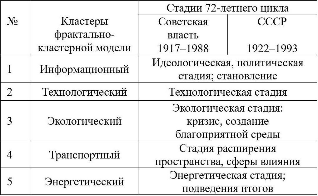 Результаты исследования. В вопросе структурирования 72-летнего цикла необходимо определить в применении к социально-историческим процессам критерии, относительно которых возможна функциональная определённость каждого из пяти выделяемых 40-летних процессов. В качестве базовых были использованы зарекомендовавшие себя характеристики пяти кластеров фрактально-кластерной модели (таб. 1), начальное же и завершающее восьмилетия получили дополнительные функции – становления (1) и подведения итогов (5):