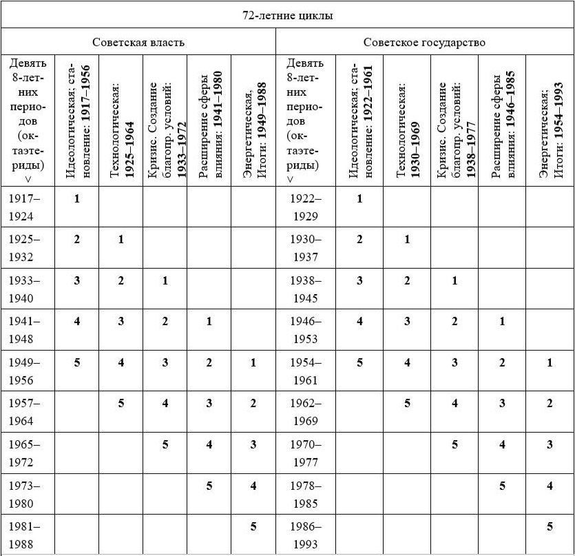 Выводы. Проведённое исследование показало, что в каждом из пяти проанализированных 40-летних циклов, составляющих 72-летний цикл исторического развития и взятых как в отношении советской власти, так и в отношении СССР, имеет место непосредственная связанность событий, маркирующих начало и завершение соответствующего сорокалетия. Это позволяет говорить о наличии строго определённых системных закономерностей, определяющих ход исторических процессов.