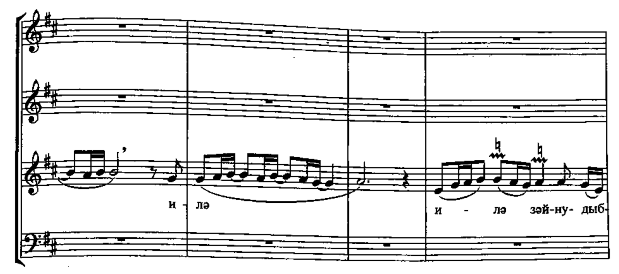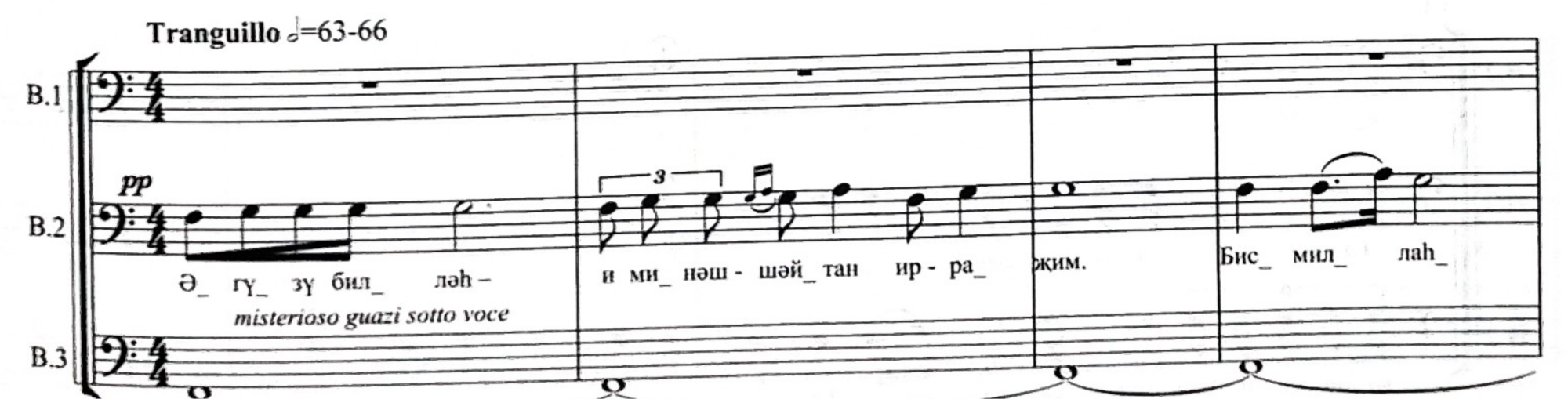 Ш. Шарифуллин, с целью передать коллективное моление, внедряет в звучание divisi голосов, деля каждую партию на три. Голоса вступают поочередно от басов к сопрано посредством канонических имитаций. Постепенно разрастаясь, двенадцатиголосная звучность, каждый голос которой является самостоятельным по мелодическому рисунку, достигает кульминации, образуя по вертикали кластер, а полифоническая фактура уступает место аккордовой. Здесь все партии в одном ритме, как бы утверждая, произносят начальную истиазу (мусульманская молитва, мольба к Аллаху о защите и покровительстве) (Пример 2).