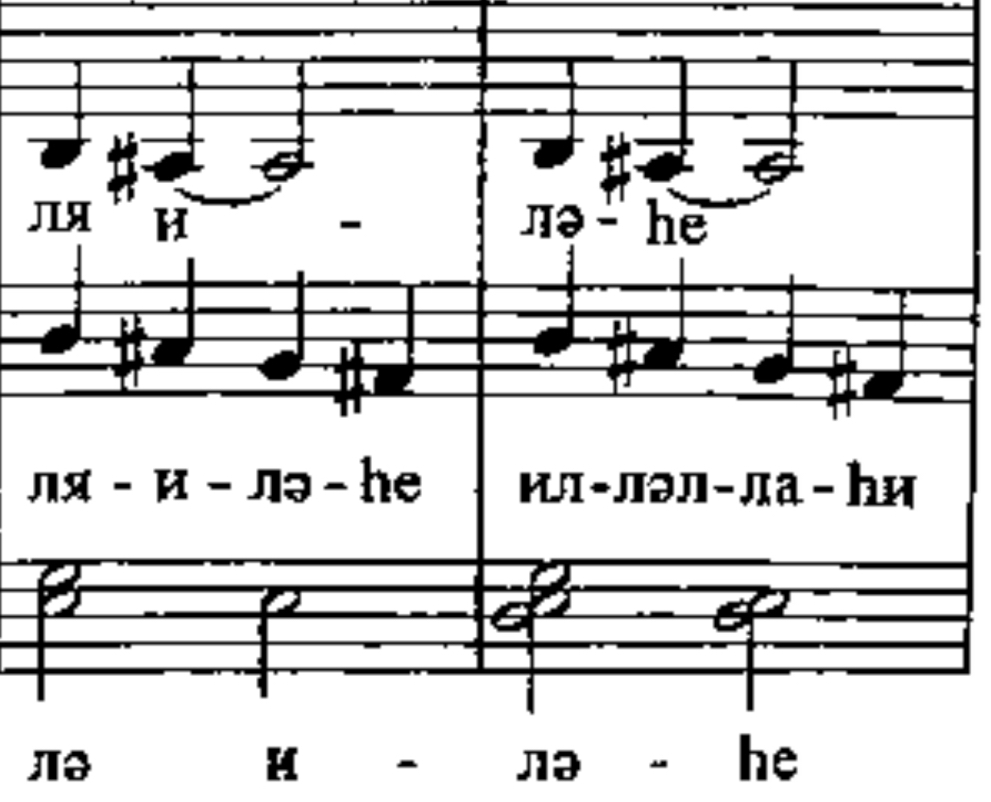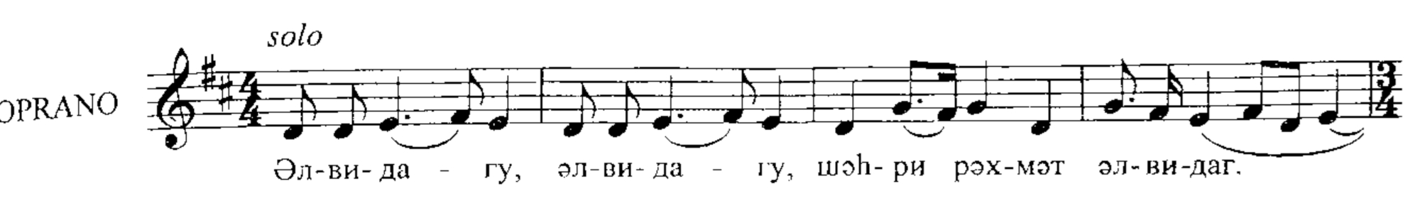 Сочинение открывает соло сопрано со словами «әлвидагу, әлвидагу, шәһрирәхмәт, әлвидаг» – «прощай, месяц благодати, до свидания» (Пример 5).