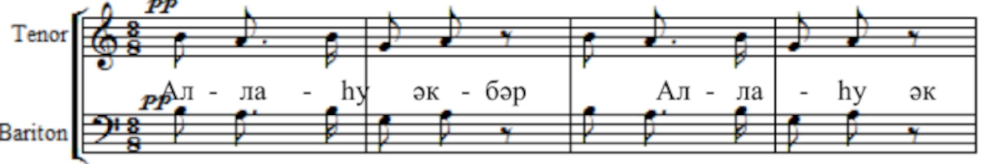 Такбир (возвеличивание Аллаха в исламе) «Аллаху акбар» вслед за С. Габяши использует композитор М. Шамсутдинова в начале кантаты «О, Эдэм балалары» («О, дети Адама») (1993). Поручая звучание тембрам мужских голосов, поющих в унисон, композитор применяет для напева традиционную для мусульман ритмоформулу с более протяженным по звучанию слогом «ла» с слове «Аллаху» (Пример 8).