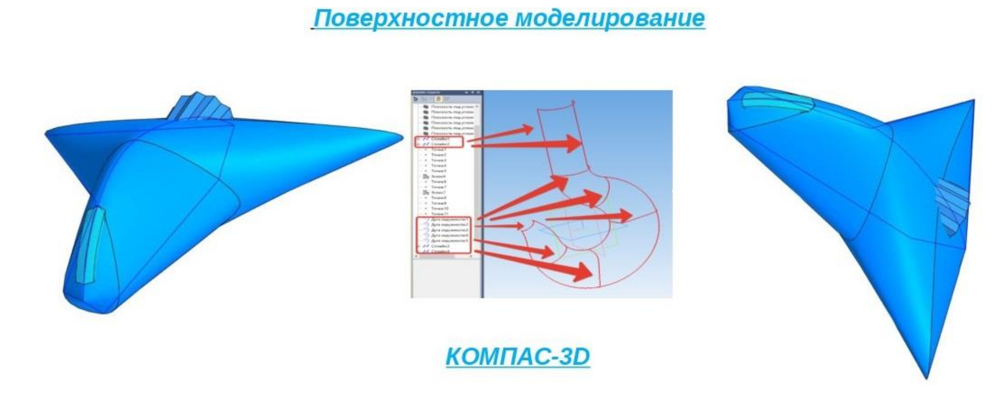 Например, при самостоятельном изучении раздела «Поверхностное и каркасное моделирование» в среде КОМПАС-3D [5, 19] молодыми исследователями были предложены оригинальные алгоритмы образования сложных поверхностей, изготовление заготовок и формообразование деталей (рис. 2).