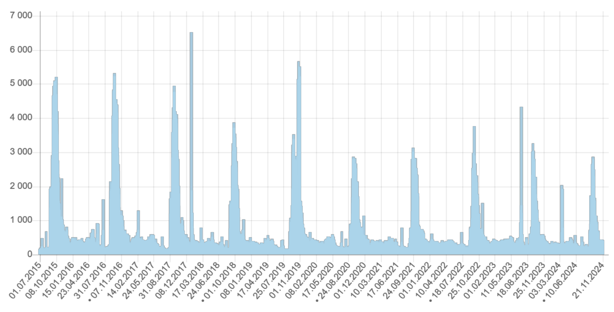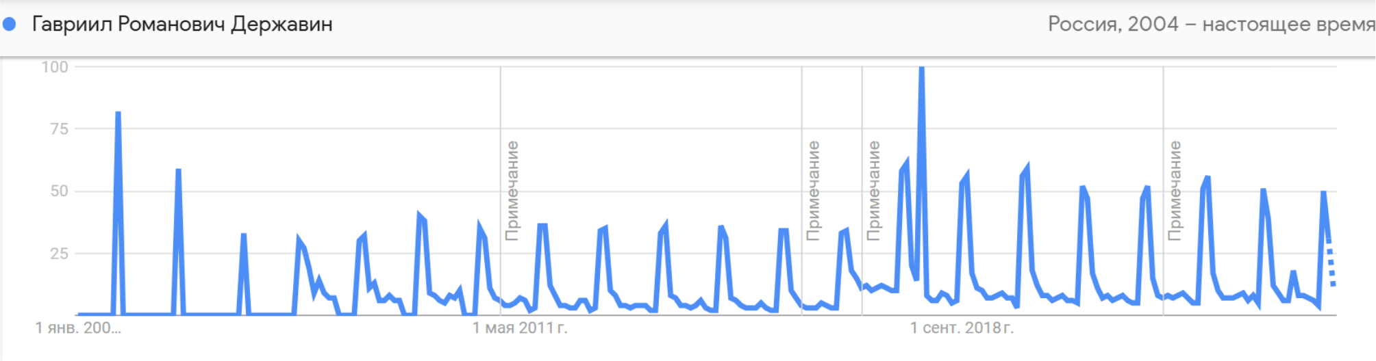 Рис. 1. Динамика популярности запросов в Google «Гавриил Романович Державин» с 01.01.2004 (Dynamics of popularity of Google queries "Gavriil Romanovich Derzhavin" since 01.01.2004)