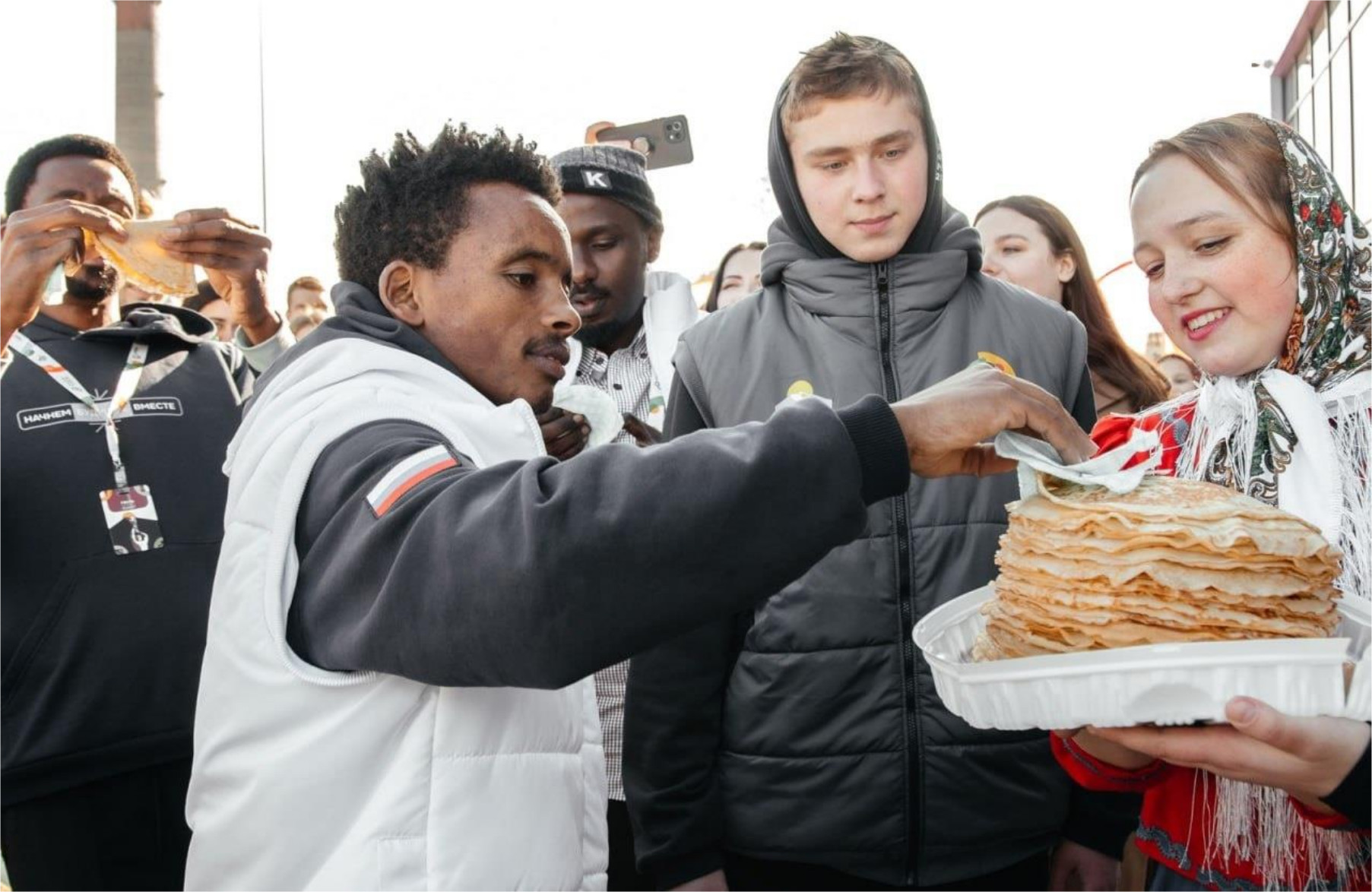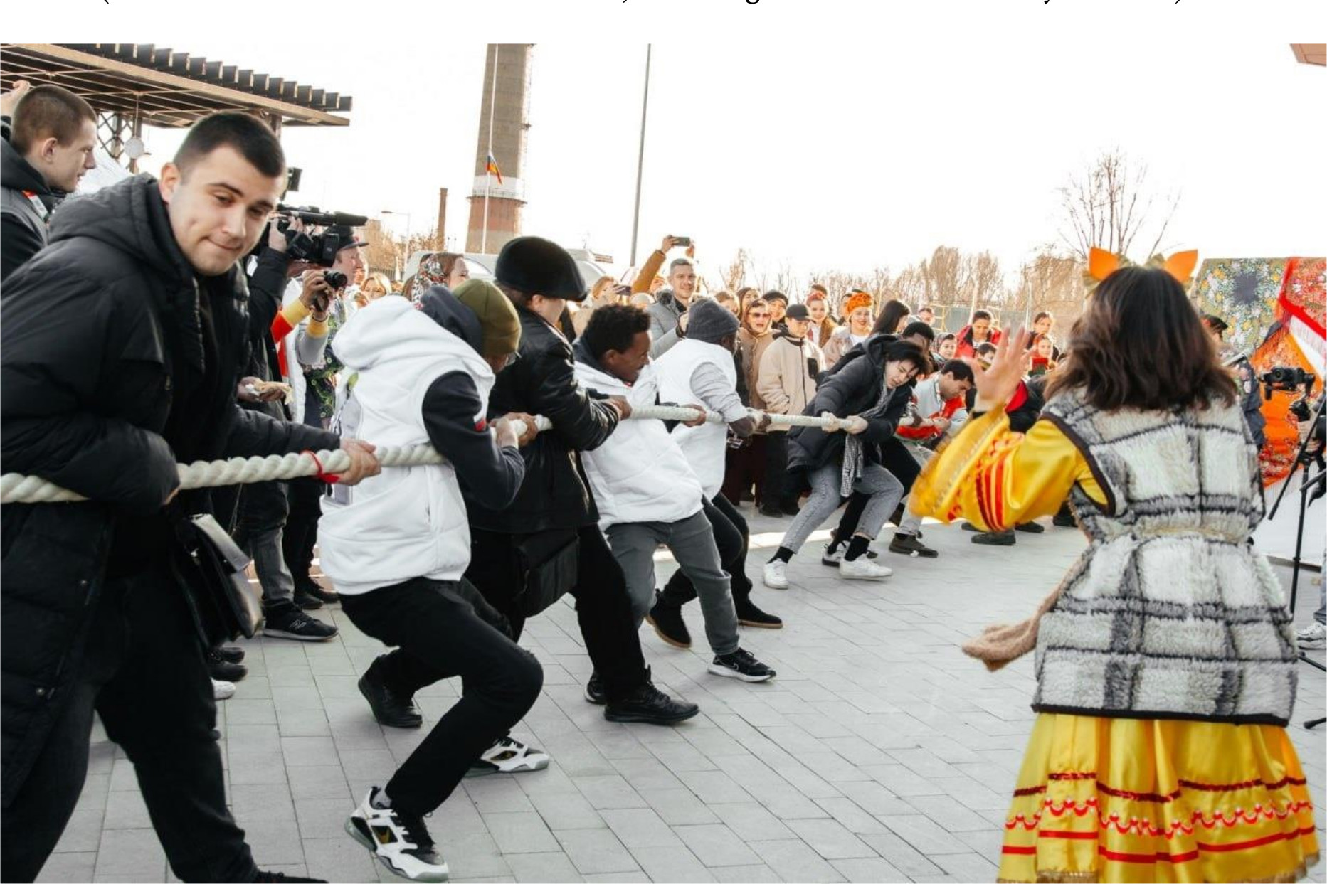 Примером подобного мероприятия мы можем назвать масленичное театрализованное гуляние «Масленица идет, блин да мед несет!», которое состоялось в марте 2024 года, возле Дома молодежи. Активное участие традиционных играх и забавах принимала участие не только молодежь г. Луганска, но и участники Всемирного фестиваля молодежи, среди которых молодые люди из Перу, Колумбии, Боливии, Анголы, Германии, Намибии, Пакистана, Эфиопии и других государств (фото 1).