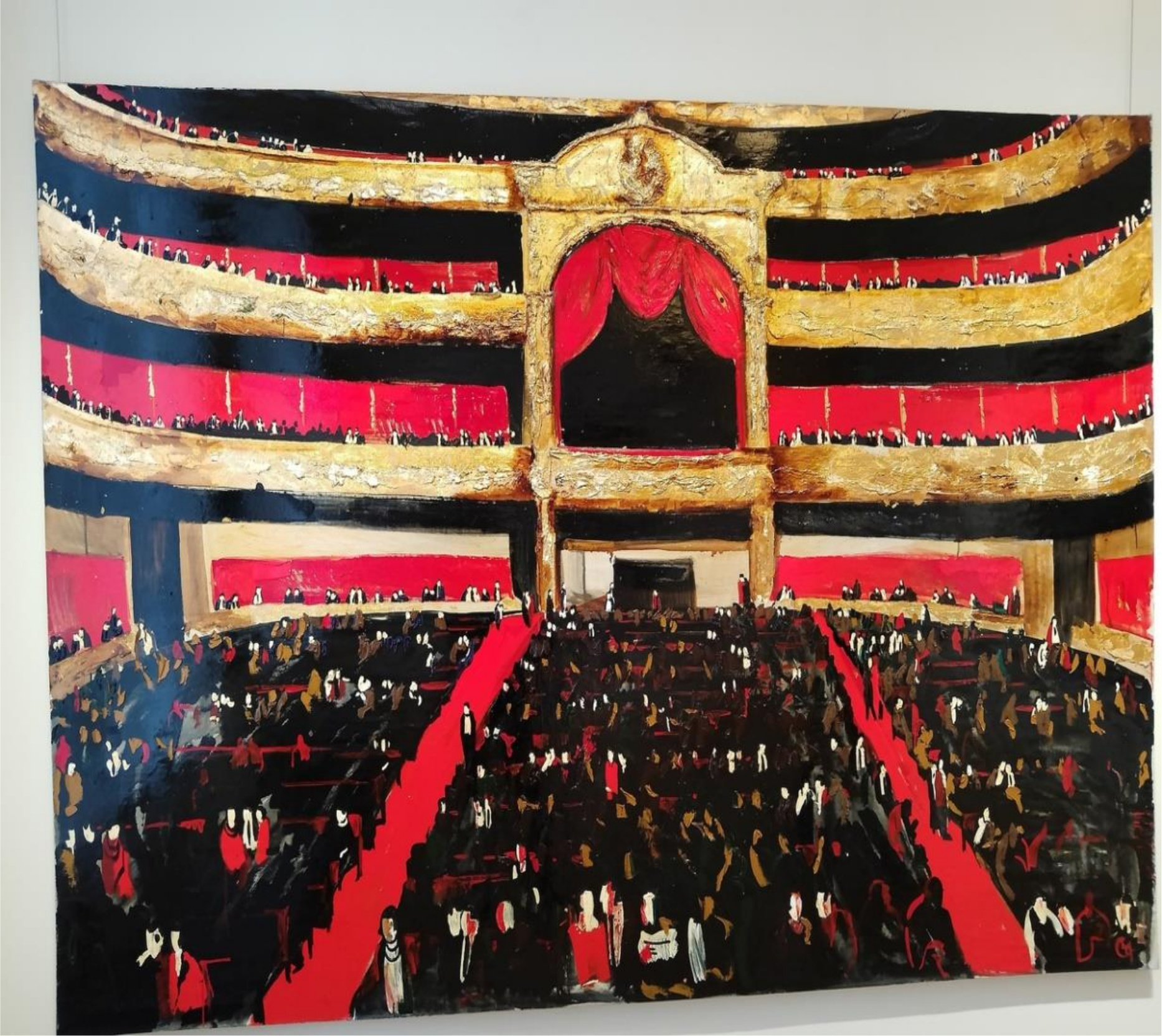«Большой театр» (фото 2) еще больше напоминает «икону» живописи экспрессионизма – Э. Нольде с его «напряженной красочностью» – барочное сочетание позолоты с насыщенным красным и черным. Зрители в зале обозначены хаотичными мазками той же цветовой гаммы, изредка – с добавлением белого. Предположительно «вовлечением» в единый цветовой поток театра и зрителя экстраполируется идея со-творчества, ритуальная стихия театрального искусства. Таким образом, от барокко, традицию которого продолжает экспрессионизм, здесь цветовая гамма, собственно от экспрессионизма – техника грубых мазков.
