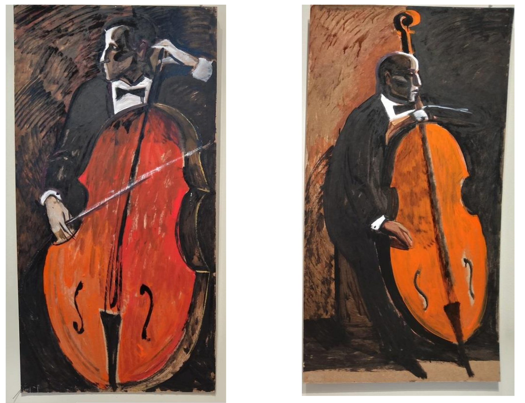 Два следующих полотна – из серии «Музыканты» (фото 4) – впечатляют смыслообразующими контрастами. Обе картины подобны полнолунию в природе: на первом плане – инструмент (контрабас) – ярким, оранжево-красным пятном на темном фоне. Говоря упрощенно, здесь инструмент – главное в личности музыканта, поэтому фигуры исполнителей едва намечены: человек, держащий инструмент, обезличен. Лица, вернее, наброски этих лиц, напоминают иконописные лики, что тоже весьма показательно. Материя Искусства поглощает личность – и личность растворяется в материи Искусства, тем самым обретая себя в новом качестве. В этом тоже – магия Театра.