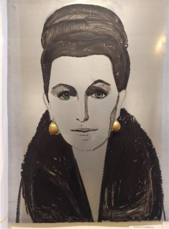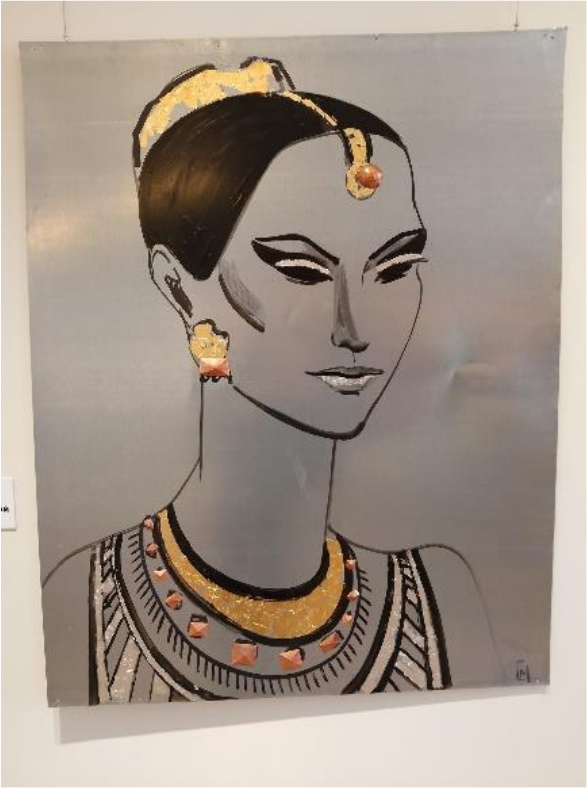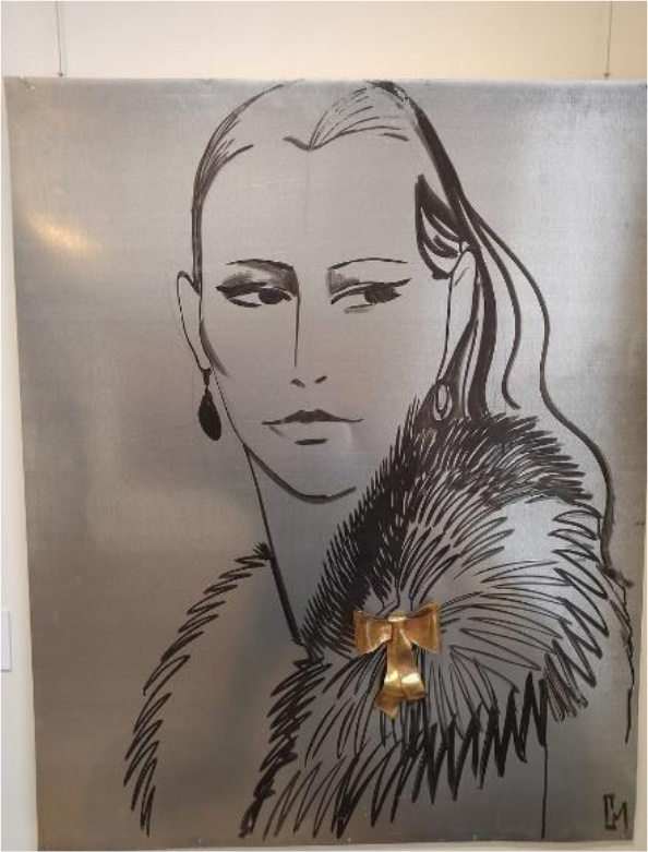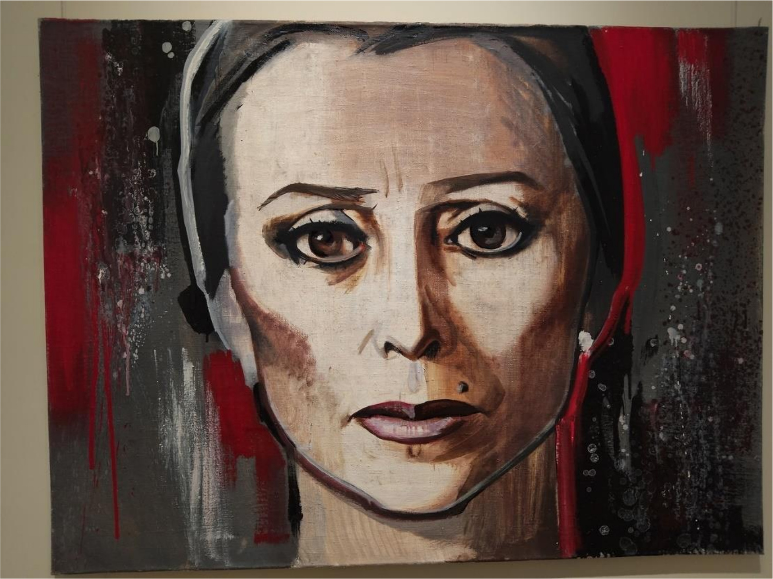 Обратимся к портретам актрис Большого театра: Марии Александровой (прима-балерина до 2017 г.), Кристины Кретовой (ведущая солистка балета), Галины Вишневской (оперная певица) (фото 9-11). Здесь также используется прием резкого контраста (черное и белое), но особый интерес представляет т. н. авторская техника. «Смешанная техника» у М. Суворовой – это обычно использование ржавого металла «как символа быстротечности жизни», интеграция в полотна потали, серебра и нефти7. На рассматриваемых же в данной статье картинах присутствует сталь (с позолотой). Золотая брошь-бант, золотые серьги, колье, золотая диадема – думается, это символы роскоши, но не столько материальной, сколько выводящей на категорию «роскошной женщины» – т. е. женщины, обладающей не только визуальной красотой, но и харизмой, шармом. Не будь их – этих деталей «роскоши» – остался бы лишь «свет невечерний» – т.е. образы женщин казались бы, возможно, излишне одухотворенными, тогда как их реальных прототипов таковыми в обычной жизни назвать было бы трудно, а значит, без элементов авторской техники обеднела бы «подача» этих образов, сузилось бы смысловое поле произведений искусства.