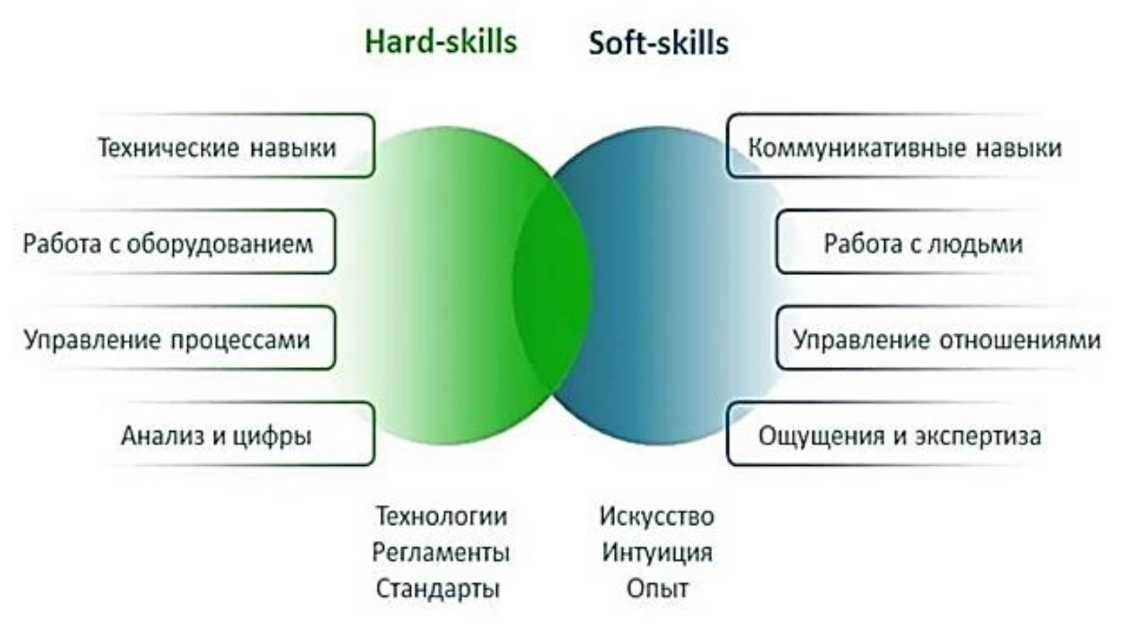 Рис. 1. Сравнительная характеристика hard skills и soft skills компетенций, которыми должны обладать будущие специалисты (Comparative characteristics of hard skills and soft skills competencies that future specialists should possess)
