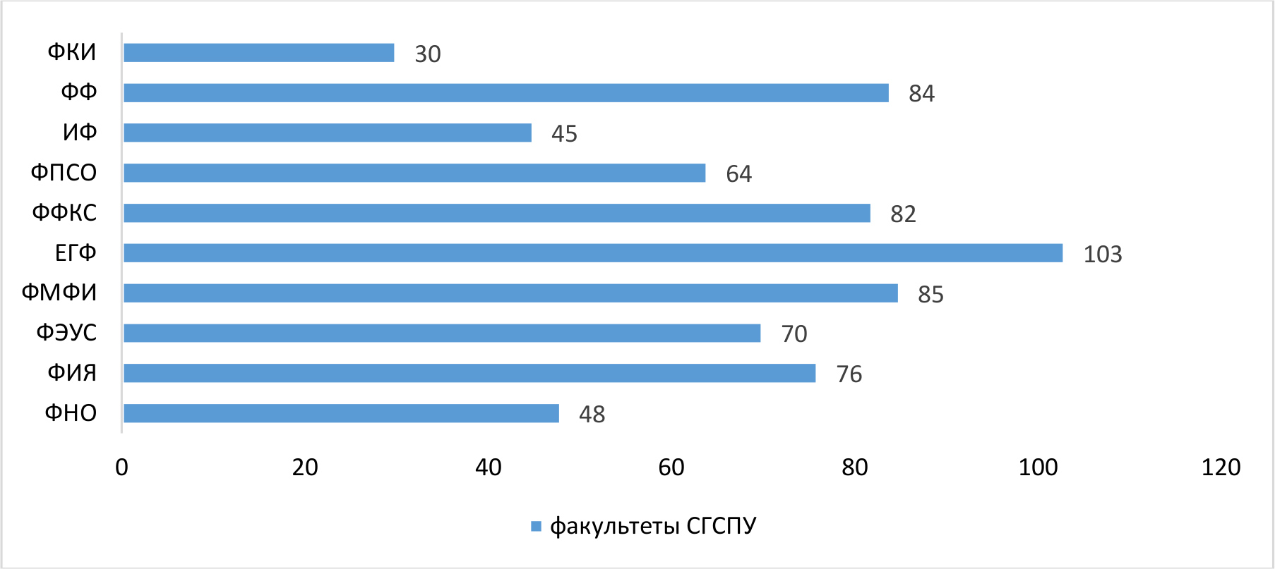 Результаты исследования. Наиболее творческими студентами среди всех факультетов, оказались респонденты филологического (ФФ) (59%) и естественно-географического (ЕГФ) (55%) факультетов. Кроме того, студенты данных факультетов также проявили повышенный интерес к научной деятельности, 27% и 52% соответственно, в то время как медийная деятельность была развита у респондентов с факультета экономики, управления и сервиса (ФЭУС) (36%) и филологического факультета (42%). Наиболее ориентированными на спортивную деятельность студентами, как и предполагалось, оказались обучающиеся факультета физической культуры и спорта – 74%, а также факультета математики, физики и информатики – 39%. Лидирующие позиции в общественной деятельности были отмечены среди студентов факультета психологии и специального образования (ФПСО) (49%) и естественно-географического факультета (52%).