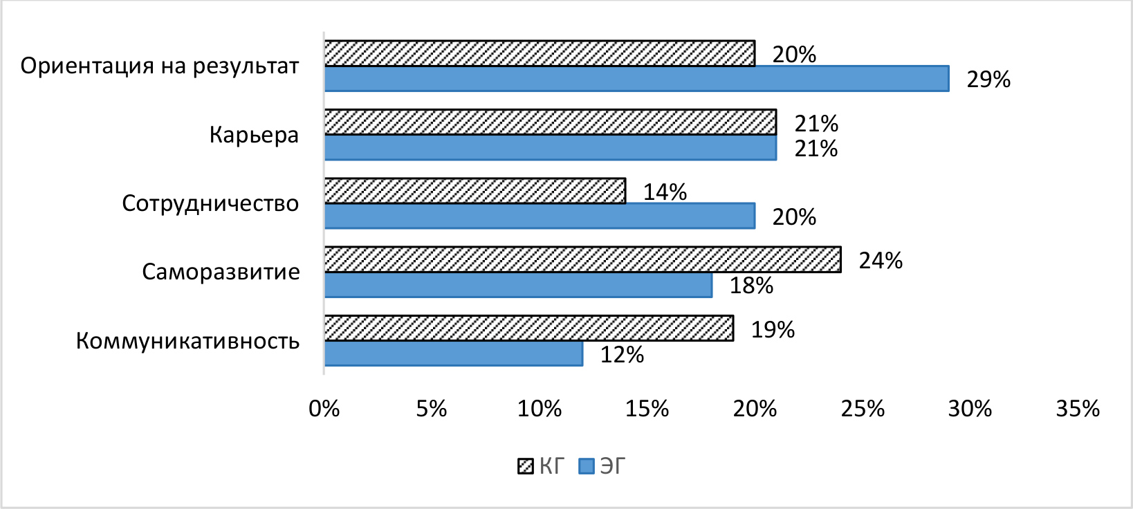 Из полученных результатов можно констатировать, что у будущих педагогов контрольной группы на высоком уровне сформировано профессиональное качество, направленное на саморазвитие (24%), в то время как респонденты экспериментальной группы ориентированы на результат (29%), что демонстрирует различия в их внутренней мотивации и целеполагания, а также различия в процессе самосовершенствования и достижения конкретных целей в рамках профессиональной подготовки.