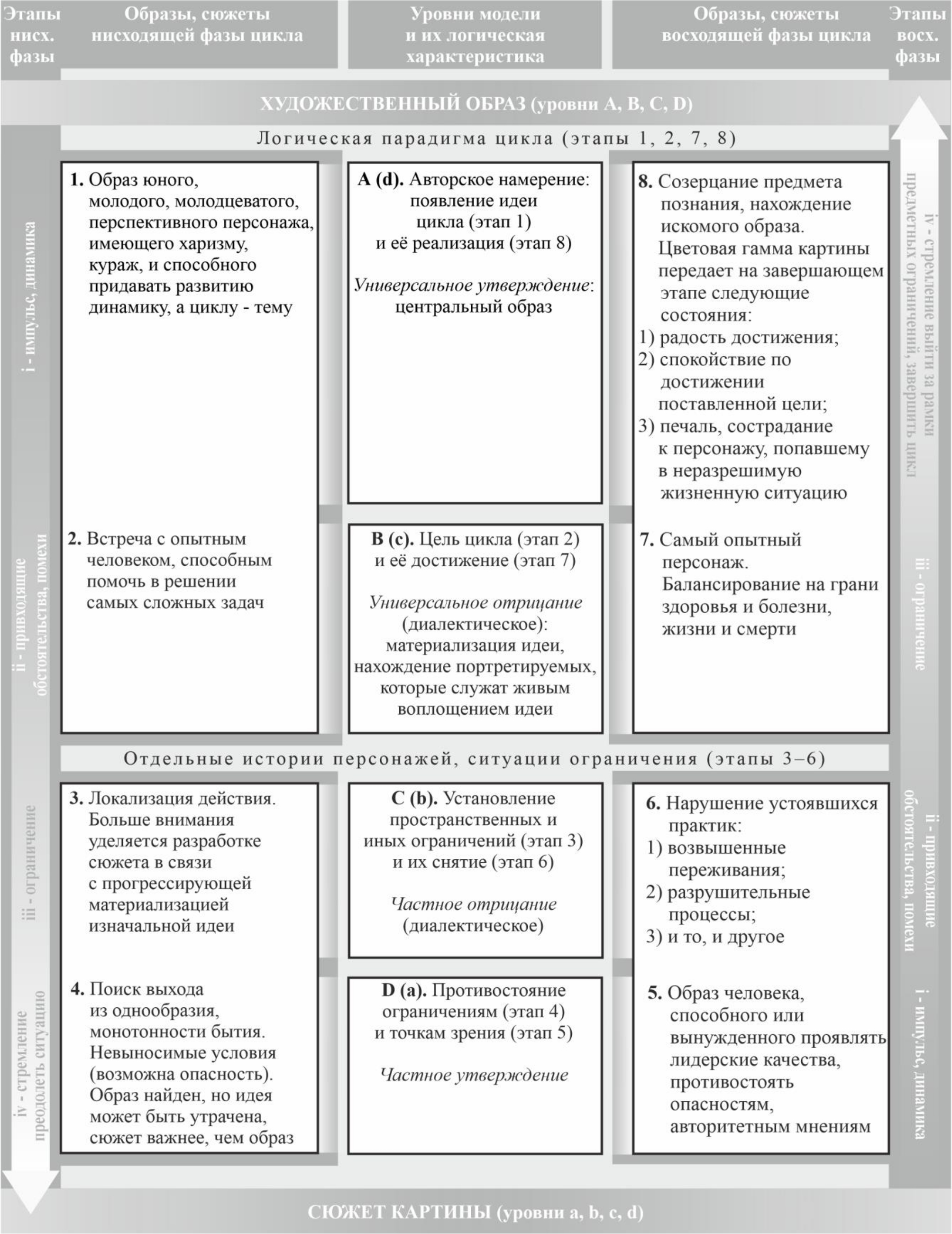 В направленности от общего к частному, обозначенной прописными латинскими буквами (уровни A, B, C, D), главное понятие – «художественный образ». В направленности от частного к общему, обозначенной строчными латинскими буквами (уровни a, b, c, d), разрабатывается событийная составляющая, представленная понятием «сюжет». Их соотношение в схеме 1 обратно пропорционально.
