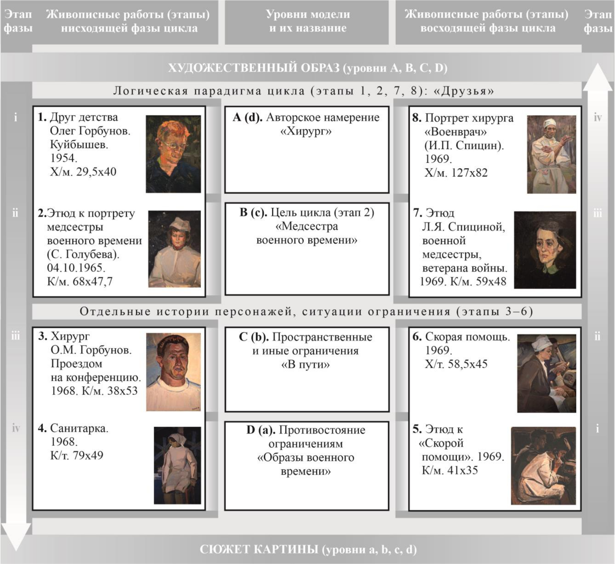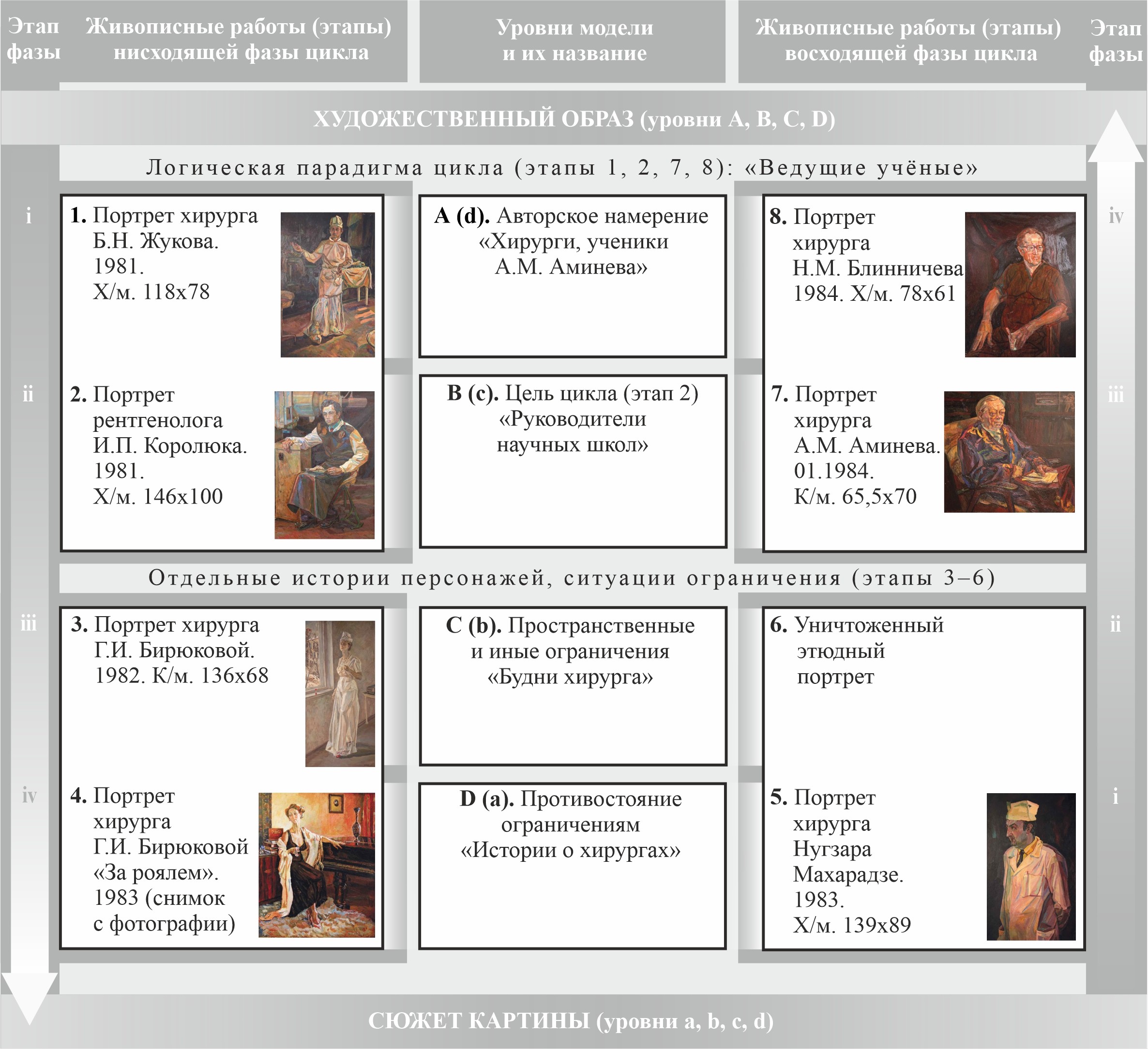 Были определены функции четырёх уровней модели, даны названия этим уровням в каждом из циклов. Определены и функции каждого этапа. Самое главное место в обоих циклах отводится четырём этапам, составляющим логическую парадигму цикла: на первых двух художник запечатлевал образы молодости, а на завершающих двух – образы людей с богатым жизненным опытом. Самый опытный и умудрённый жизнью образ занимает в обоих циклах седьмую позицию. В калининградском цикле этапы логической парадигмы получили название «Друзья», в куйбышевском – «Ведущие учёные». Центральные этапы (с 3-го по 6-й) составили встречи с медиками, отражающие этапы размышления художника над медицинской тематикой.