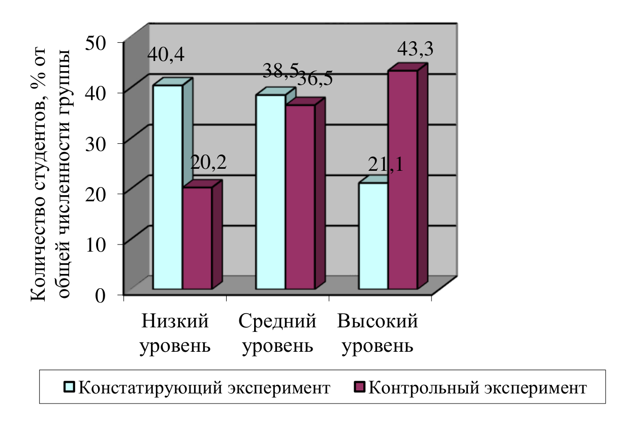 Рис.1. Изменение уровня развития когнитивного компонента готовности к исследовательской деятельности в экспериментальной группе (Changes in the level of development of the cognitive component of research readiness in the experimental group)