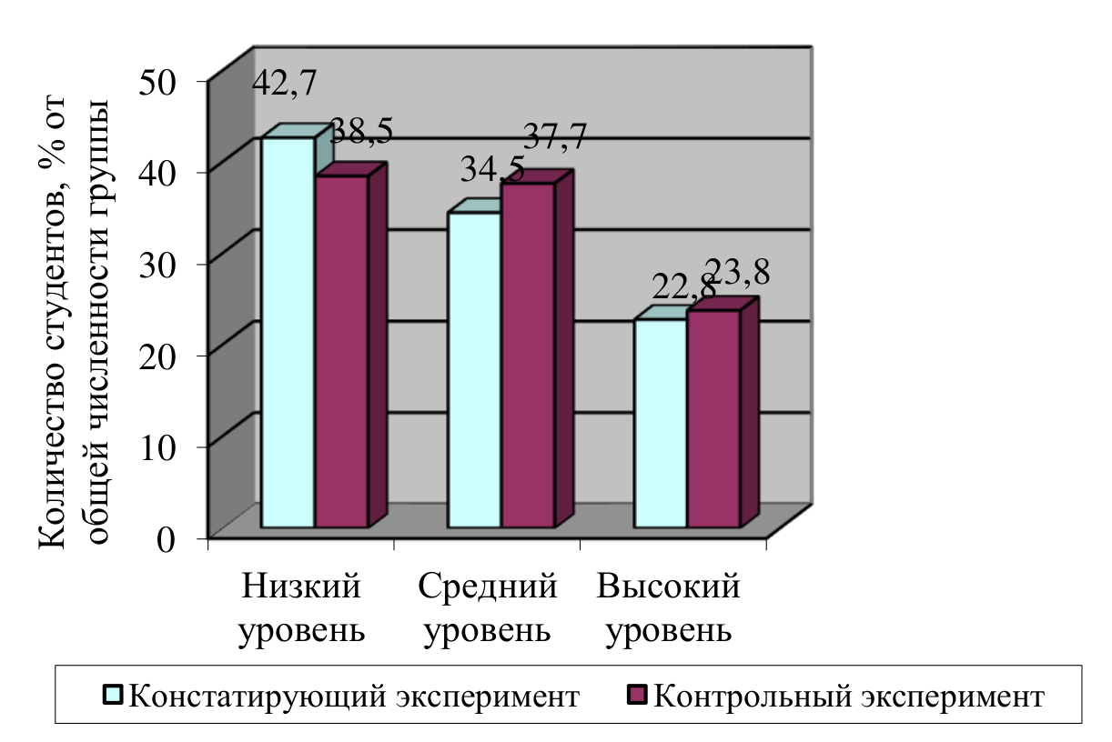 Педагогический эксперимент состоял из трех этапов: констатирующего, формирующего и контрольного. Диагностика когнитивного компонента всех участников эксперимента проводилась дважды: в ходе констатирующего и контрольного этапов. В ходе формирующего этапа была апробирована программа дисциплины «Методы исследовательской и проектной деятельности», которую изучали только участники экспериментальной группы. Результаты педагогического эксперимента представлены на Рисунках 1 и 2. У большинства студентов экспериментальной группы уровень развития когнитивного компонента готовности к исследовательской деятельности повысился, в то время как в контрольной группе данный показатель практически не изменился.