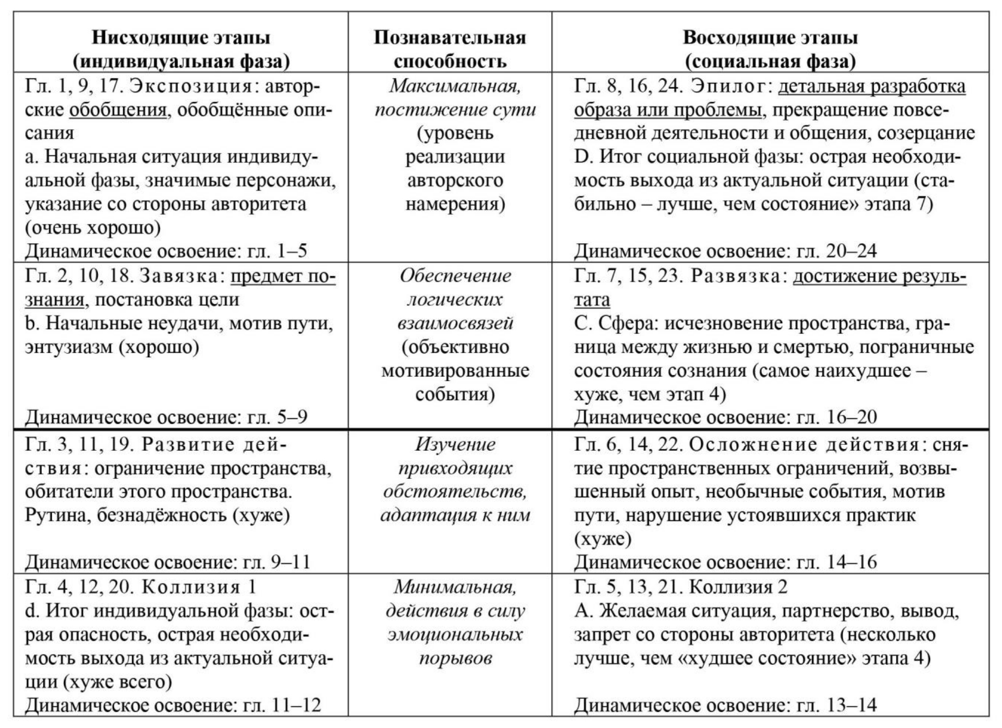 В качестве оптимального для художественного повествования принят 8-элементный цикл, приведённый на Рис. 1. Рисунок содержит указание на этапы метрического освоения соответствующего поля (ячейки) – 1, 9, 17, в нижней части соответствующего поля (ячейки) указаны этапы динамического освоения, особенность которого во включении «пограничных» глав в каждые две смежные стадии: 1–5, 5–9, 9–11, 11–12.