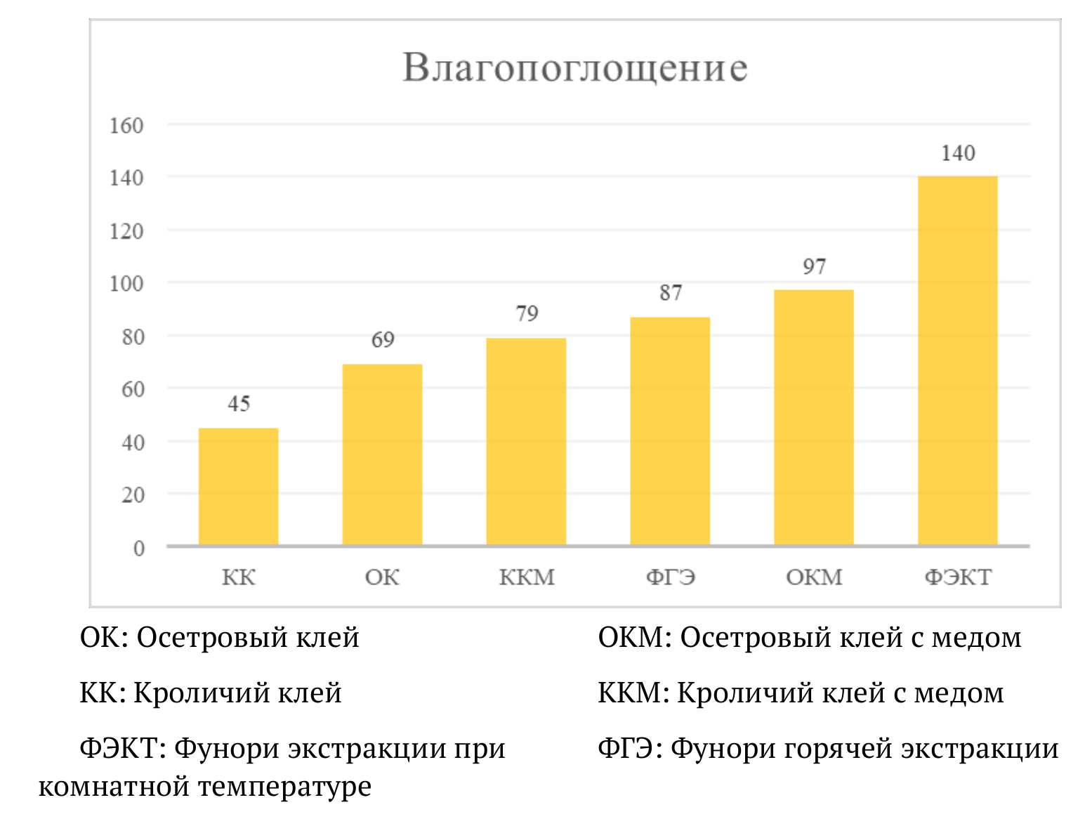 По результатам измерений было установлено, что пленки кроличьего клея способны поглощать меньше среднего (было вычислено среднее значение между этими тремя клеями) количества влаги из окружающей среды, то есть 45% от ее первоначального веса, пленки из осетрового клея поглощают несколько больше влаги – 69%; в обоих случаях добавление меда увеличивает гигроскопическую способность пленки клея до 79% и 97% соответственно. Что касается фунори, разница между влагопоглощением пленки фунори горячей экстракции и при комнатной температуре заметно варьируется: 87% и 140% соответственно.