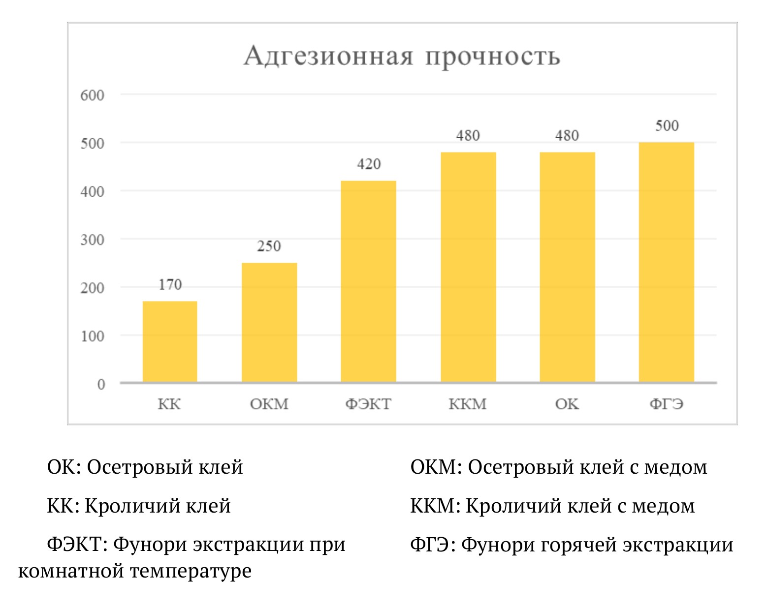 | Ряд: кроличий клей ˂осетровыйклей с медом ˂фунориэкстракциип.к.т ˂кроличийклейсмедом = осетровыйклей˂фуноригорячейэкстракции Результаты показывают, в случае экспериментов по измерению адгезии образцов, склеенных с помощью фунори, результаты аналогичны значениям тестов с глютиновыми клеями. | ||||||