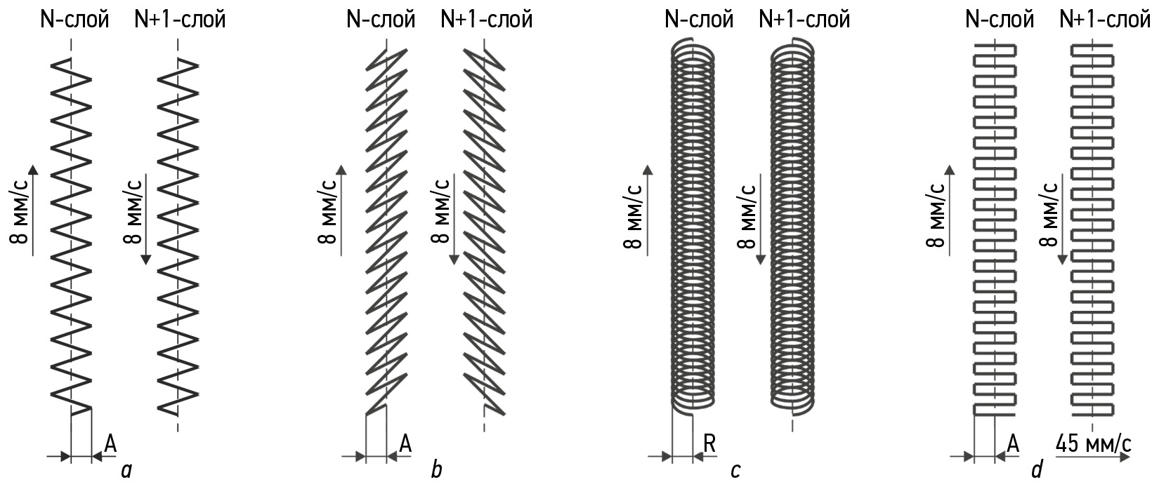 Рис. 1. Схема наплавки слоев: a ― линейные колебания перпендикулярно направлению выращивания; b ― линейные колебания под углом 45 градусов относительно направления выращивания; c ― эллиптические колебания вдоль направления выращивания; d ― змейка.