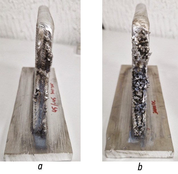 Рис. 4. Внешний вид участка начала/завершения процесса: a ― линейные колебания под углом 45 градусов относительно направления выращивания; b ― эллиптические колебания вдоль направления выращивания.