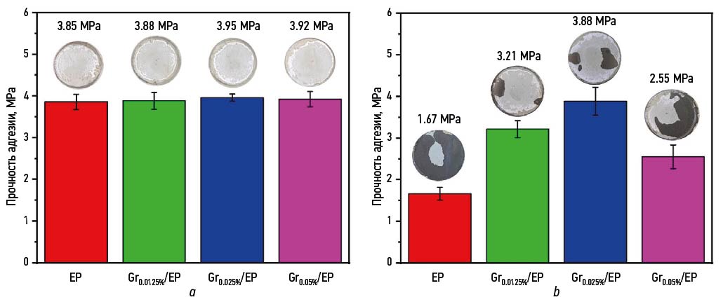 В данном случае прочность сцепления различных типов покрытий с металлической подложкой измерялась с использованием метода испытаний на отрыв. В начальных испытаниях, где покрытия были проанализированы в исходном, нетронутом состоянии, все покрытия включали чистое эпоксидное покрытие (EP) и модифицированные графеном покрытия (Gr 0,0125 % /EP, Gr 0,025 % /EP, Gr 0,05 % /EP)), продемонстрированы общие показатели прочности сцепления, достигавшие порядка 4 МПа, как показано на рис. 3, a. Эти результаты соответствуют высоким адгезионным характеристикам эпоксидных смол, которые обусловливают их химический климат. Эпоксидные смолы содержат активные полярные группы, способные образовывать прочные химические вещества и физические связи с металлической подложкой, что обеспечивает эффективное прилипание покрытия к субстрату.