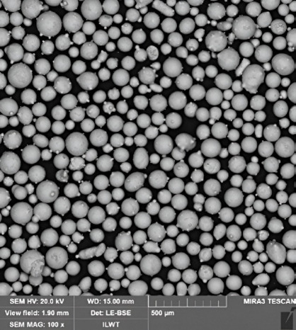 В табл. 2 приведен химический состав сплава Stellite-21, который выступает в роли материала для восстановительной наплавки. Форма частиц порошка сферичная, фракция составляет 40–150 мкм, морфология металлического порошка представлена на рис. 2.