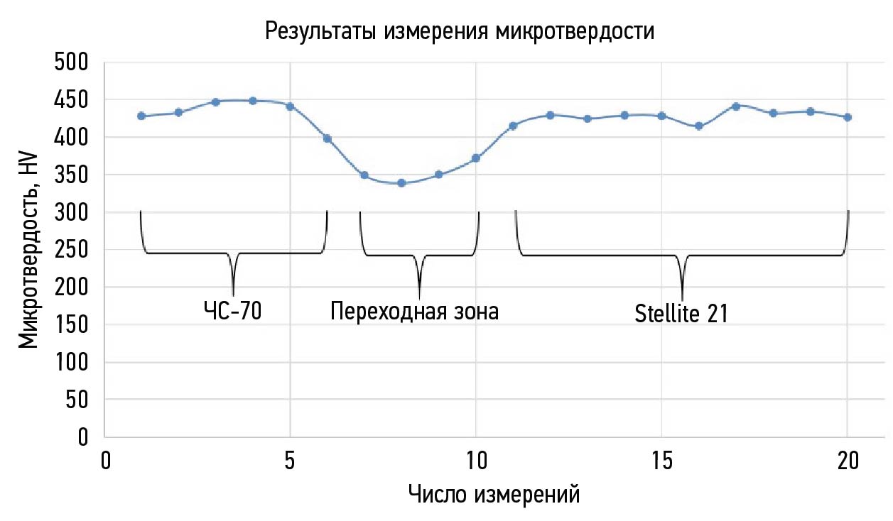 Из результатов измерения микротвердости по длине образца видно, что микротвердость основного и присадочного материала схожи. Однако в переходной зоне наблюдается небольшой спад микротвердости, что соответствует области перемешивания сплавов и образования периферийной структуры.