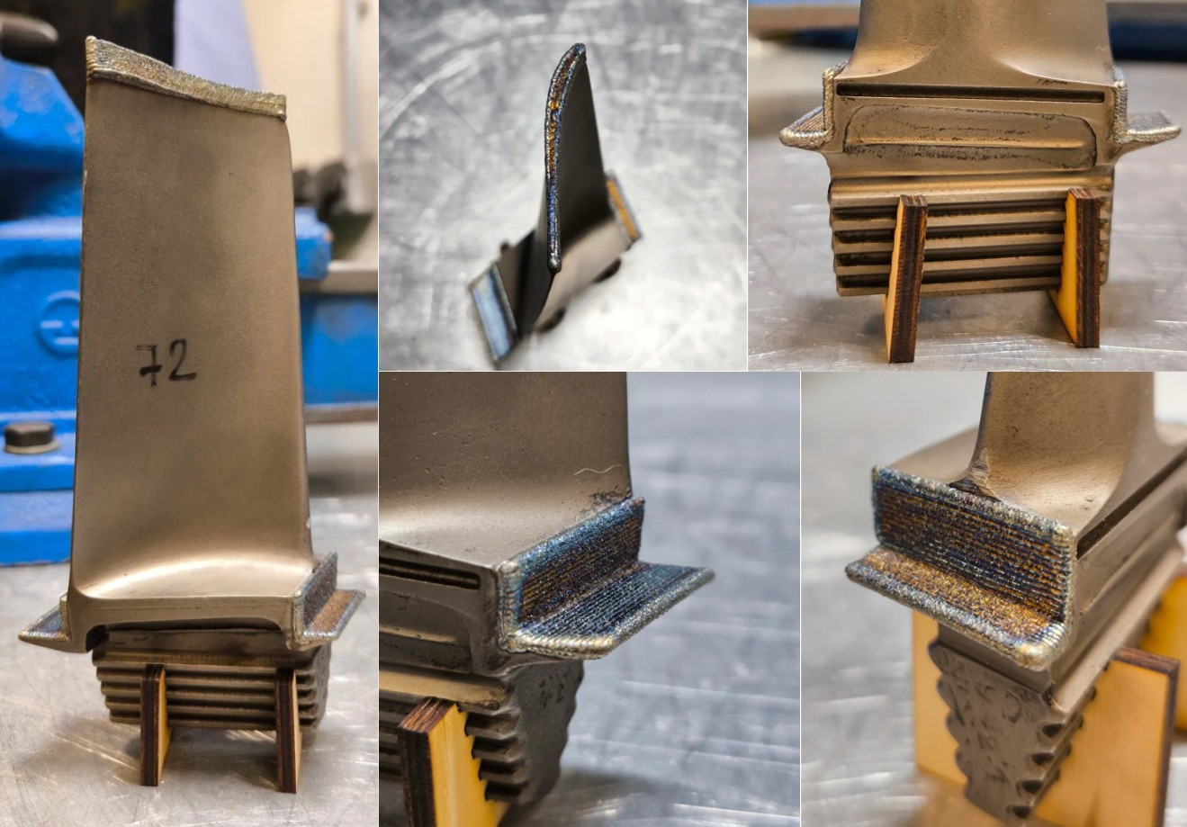 Авторы исследования [8] реализовали метод лазерной порошковой наплавки для восстановительного ремонта геометрии пера лопатки турбины, изготовленной из жаропрочного сплава. Для разработки стратегии наплавки и наилучшего формирования наплавленного слоя на перо лопатки авторы производили компьютерное моделирование процесса с измерением температурных полей в основном металле лопатки. Помимо этого, был подобран рабочий режим наплавки, где в качестве присадочного материала выступал сплав Inconel 718, после чего была отработка геометрии пера на подложке. В конечном итоге авторам удалось восстановить перо изношенной лопатки с небольшим припуском.