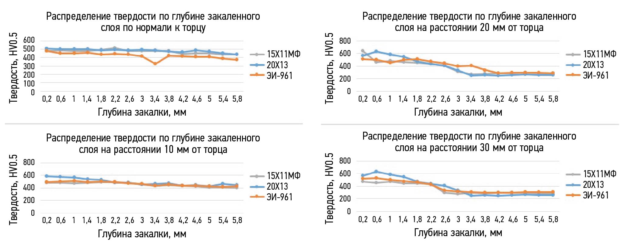 Для полученных образцов была измерена твердость закаленной зоны (по линиям, указанным на рис. 4, верх), результаты представлены на графиках (рис. 5).