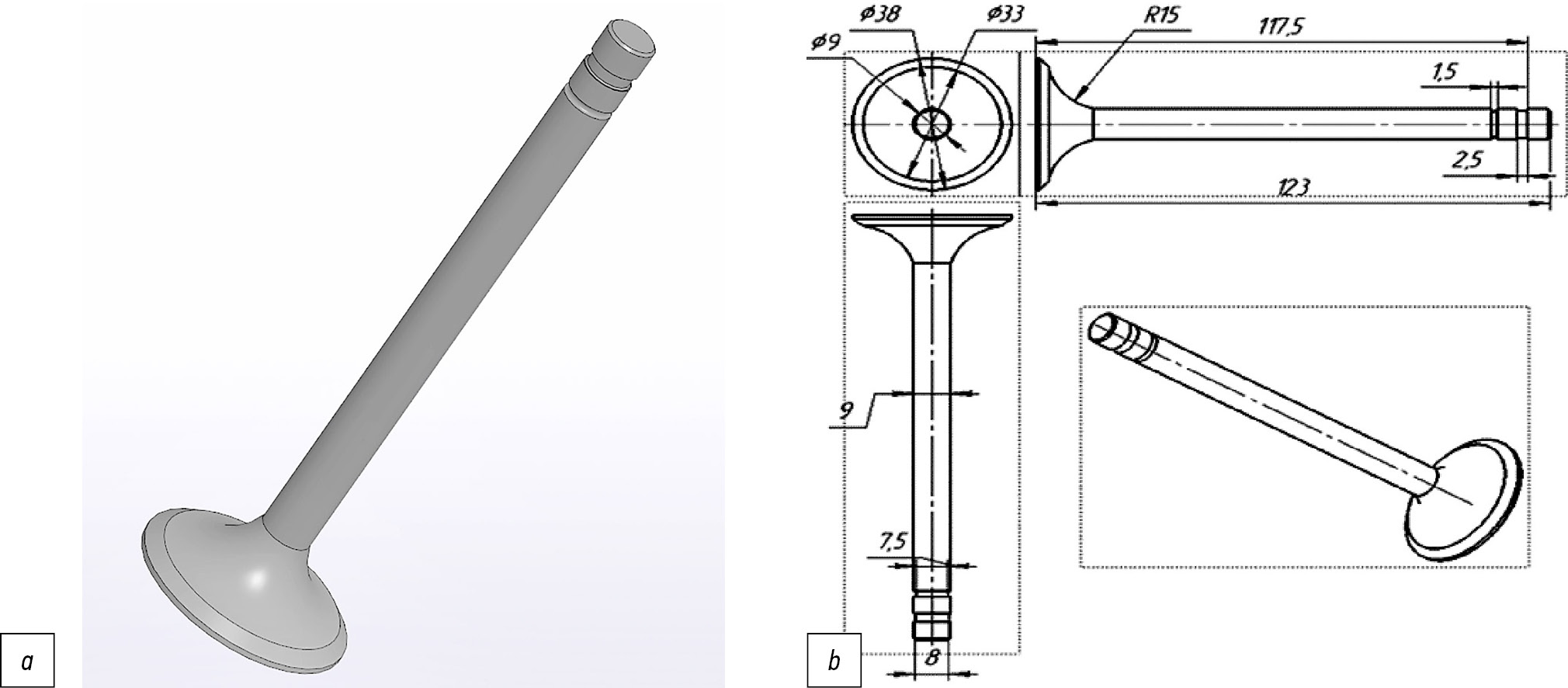 Рис. 1. Общий вид исследуемого клапана судового малоразмерного двигателя Ч8,5/11: а — представленный в 3D модели; b — основные размеры клапана [8].