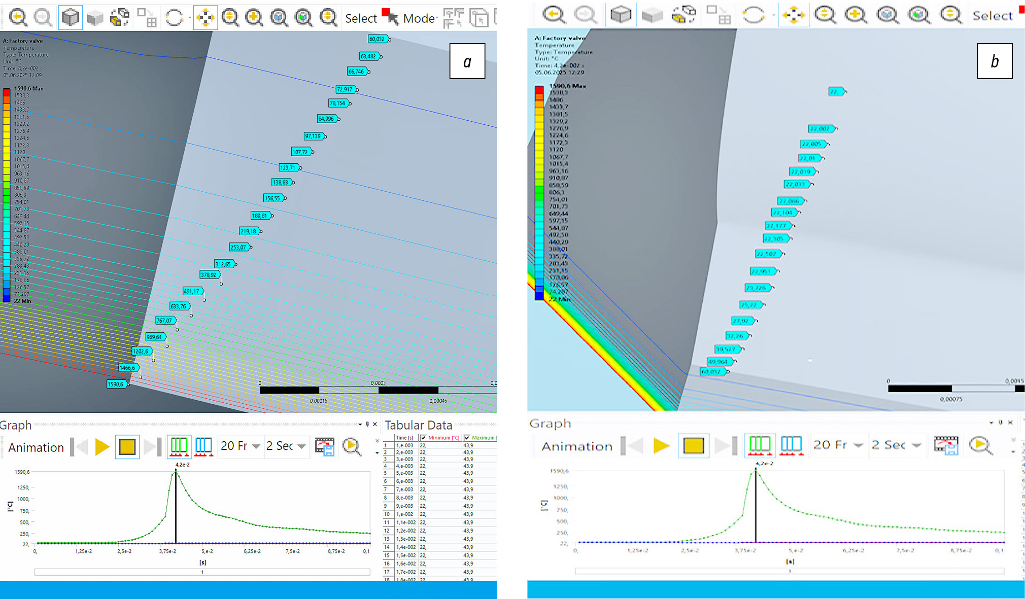 Рис. 10. Фрагмент распределения температуры внутрь тарелки клапана от 1590,6°С до 60°С, данное расстояние от max до min температуры = 1 мм (a); распределение Т от 60°С до 22°С, на расстоянии более 3 мм вглубь тарелки (b).