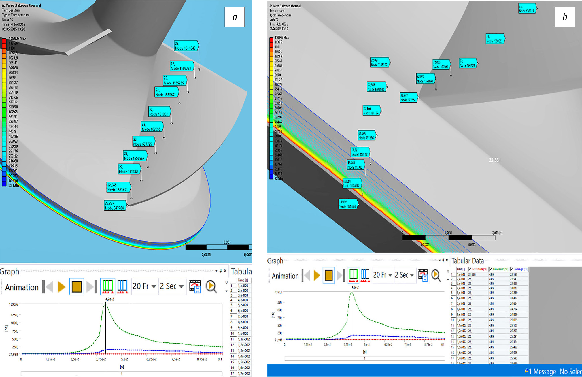 Временной интервал исследования составляет доли секунд, а именно согласно рис. 2 от 0,02 до 0,1 с. Результаты динамического термомеханического расчёта брались в наивысших, максимальных (max) нагрузках в данном временном интервале. По температуре максимум составил на временном отрезке 0,0419 с с наивысшей Т = 1591,10°С. Температура внешней среды в момент исследований оставалась постоянной и равнялась 22°С.
