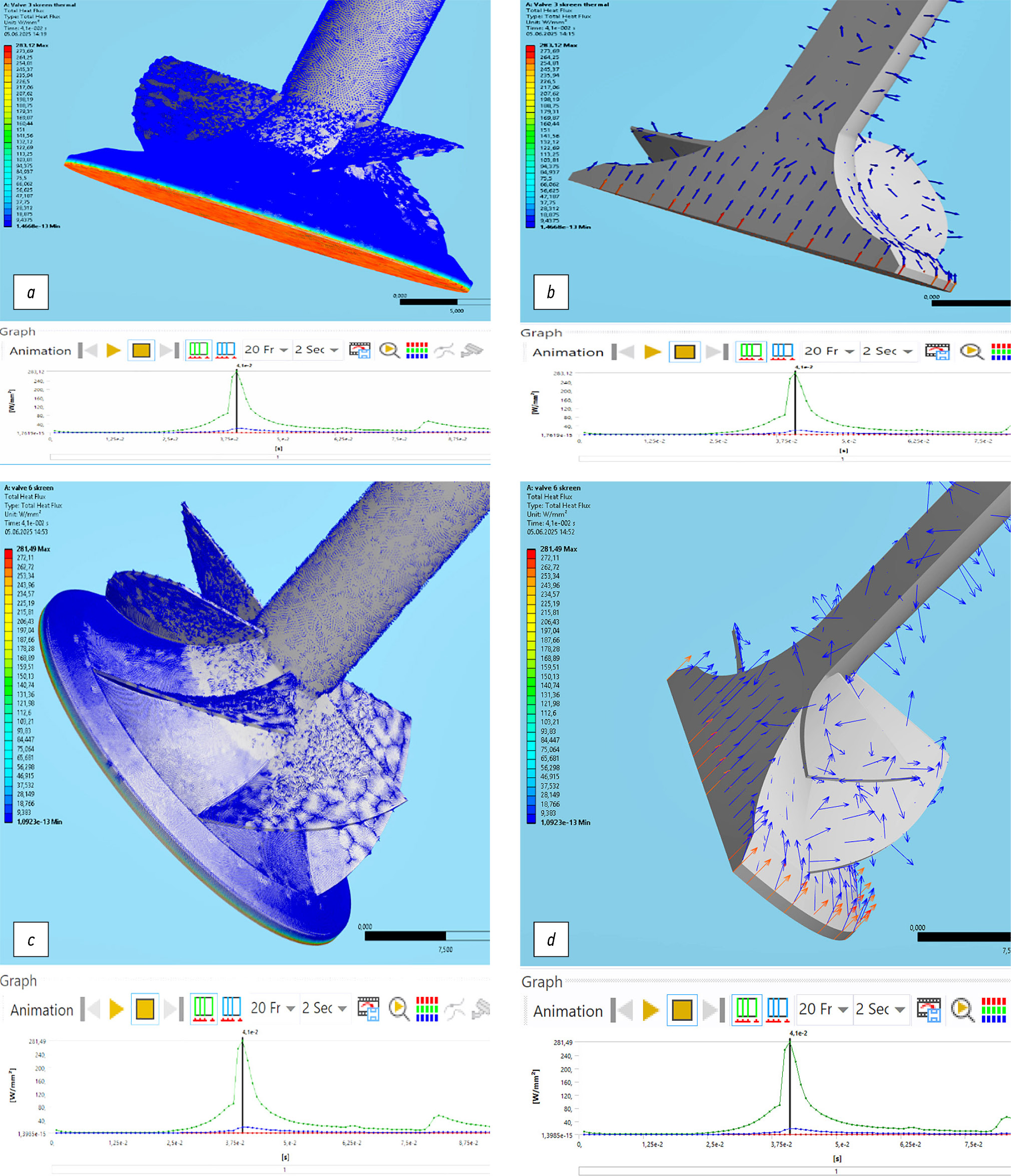 Рис. 13. Визуализация движения теплового потока на клапане: а, b — с 3 лопастями; c, d — с 6 лопастями.