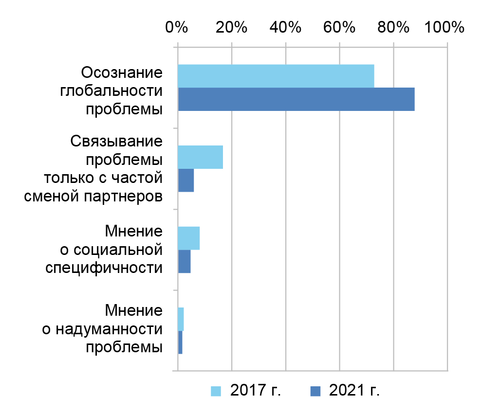 Results. The proportion of people who had an objective idea of the risk of contracting sexually transmitted infections increased from 72.8% (2017) to 87.8% (2021), while the association of the threat only with the frequent change of partners was noted significantly less often (5.9% in 2021 and 16.7% in 2017). The proportion of students linking the risk with social status has decreased from 8.1% to 4.7%, which may indicate a tendency for more objective ideas about the risks of sexually transmitted infections.