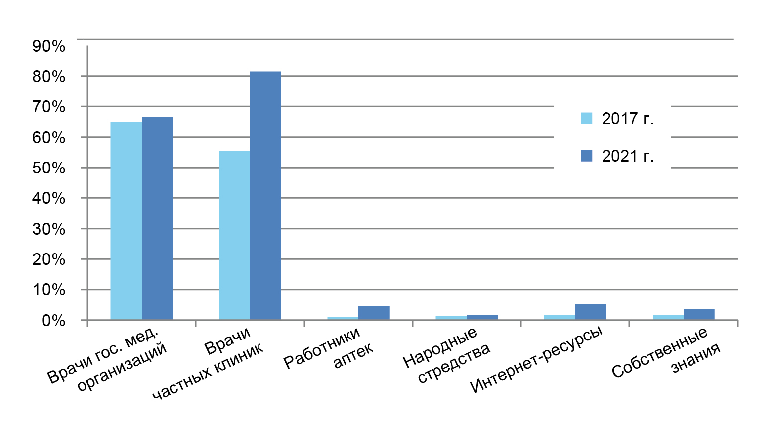 According to the 2021 survey, the problem of sexual infections is objectively assessed by 87.8% of respondents. Their position is that the threat of the spread of these diseases is global, the risk exists for all those who are sexually active, and certain prevention and vigilance measures are required from everyone, which is confirmed by the epidemiology of sexually transmitted diseases and risk factors for their spread. Opinions about the social specificity of the problem are shared by 9.6% of respondents, with 5.9% linking the risk exclusively with the frequent change of partners, and 4.7% with the social status of patients, declaring the circulation of pathogens exclusively in disadvantaged categories. Despite the allocation in the literature of the concept of "super-distributors" of sexual infections, who really lead a promiscuous sex life and do not always represent prosperous strata of society, the situation with the spread of STIs is characterized by the loss of social specificity of diseases. Knowing young people about this is an important condition for safe behavior. The share of those expressing an opinion about the far-fetchedness and exaggeration of the problem of sexual infections is minimal - 1.6%. Compared to 2017, the proportion of those who have objective ideas about the risk of contracting sexual infections has significantly increased (from 72.8% to 87.8%, p = 0.007) (Fig. 1). At the same time, the association of the threat exclusively with the frequent change of partners began to be noted significantly less frequently (5.9% in 2021 versus 16.7% in 2017, p=0.004). Decreased, albeit slightly, from 8.1% to 4.7% (p=0.061), the share of those linking risks with social status. Thus, a tendency to objectify ideas about the risk of the spread of sexually transmitted infections has been revealed. The increase in the prevalence of objective self-assessment of the risk of contracting sexually transmitted infections has naturally led to an increase in the proportion of students who are aware of the need for screening for STIs: from 65.3% in 2017 to 86.6% in 2021 (p=0.004). So, if in 2017 88% of students demonstrated their willingness to seek help from specialized specialists, then in 2021 - 97.4% (p=0.003), i.e. out of almost 500 respondents, only 13 people declared their intention to be treated on their own without applying to medical organizations. At the same time, the level of trust in the state dermatovenerological service remained practically unchanged (64.8% in 2017 and 66.4% in 2021, p = 0.068), and interest in visiting private clinics increased significantly (from 55.4% in 2017 to 81.5% in 2021, p=0.005) (Fig. 2). At the same time, if in 2017 the desire to receive assistance in state medical organizations prevailed, then the situation in 2021 has changed significantly - this is the first time among young people that a significantly higher desire to go to private clinics than to public ones (81.5% vs. 4% respectively). dispensaries. It should be noted that in 2021, compared to 2017, the level of trust in pharmaceutical workers increased statistically significantly (4.5% are ready to listen to their opinion against 1.1% in 2017, p = 0.003). The share of Internet resources relying on materials, including electronic publications, also increased (5.2% vs. 1.6% in 2017, p=0.004). The proportions of those willing to rely on their own knowledge or trusting traditional medicine remained practically unchanged and rather small. At the same time, the opinions of 13 people focused exclusively on self-treatment (who do not want to go to doctors) are represented by attitudes to the use of Internet resources and their own professional knowledge, and only 1 person indicated their intention to use folk remedies.