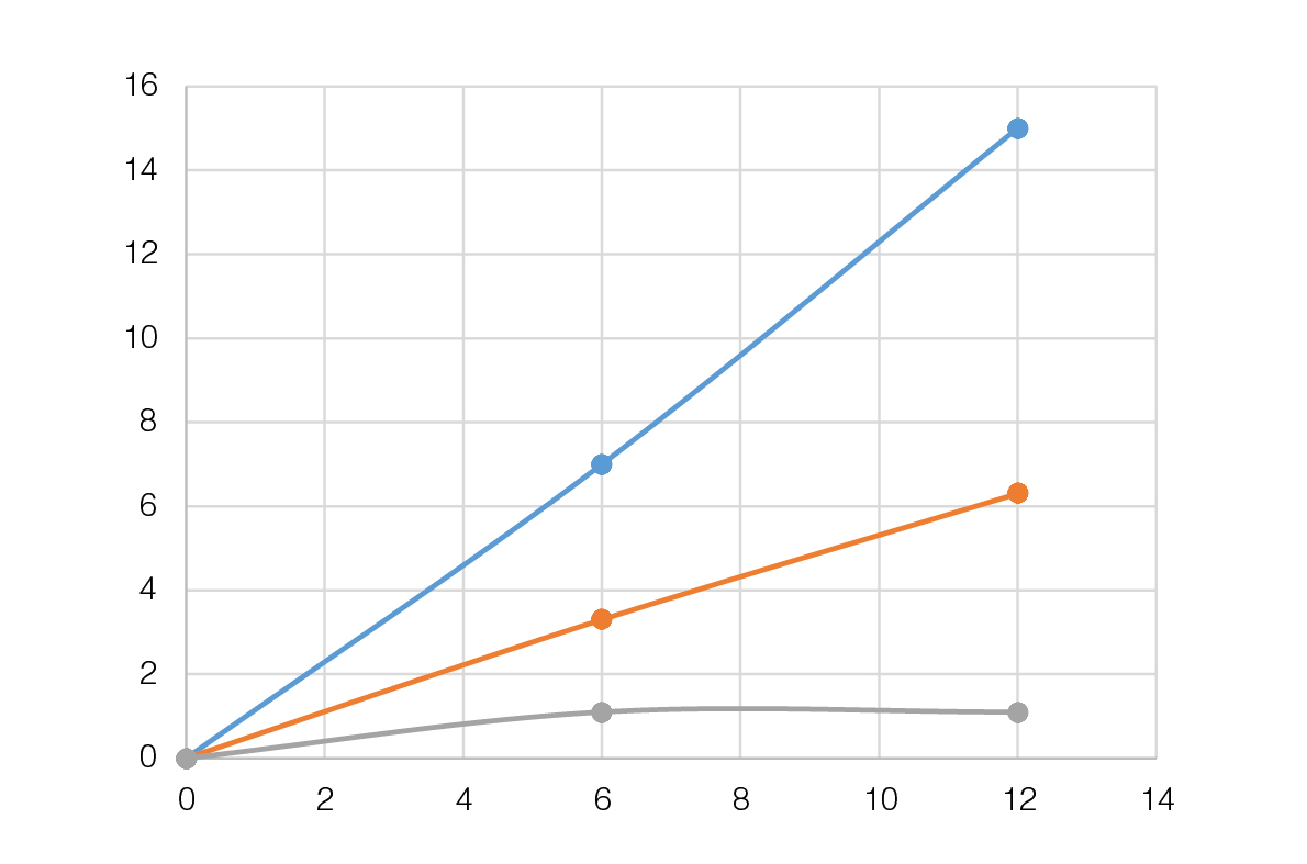 Рисунок 1. Артериальные тромбоэмболические события в подгруппах в течение одного года (р<0.05). По оси абсцисс указан период в месяцах, по оси ординат – суммарные тромбоэмболические осложнения (в %). Голубой цвет графика соответствует подгруппе А, оранжевый цвет – подгруппе Б, серый цвет – контрольной группе.