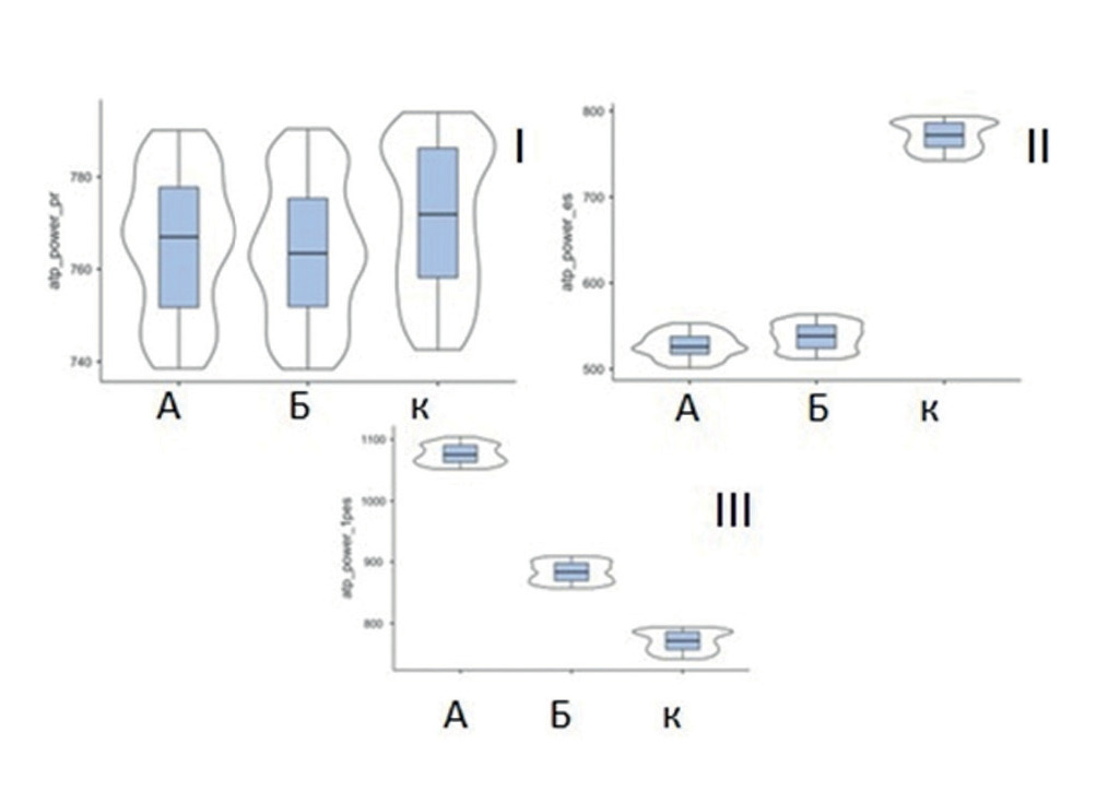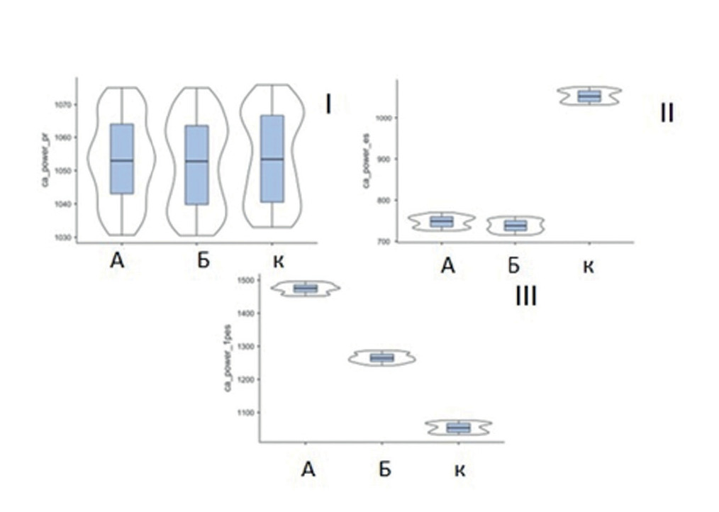 Рисунок 3. Изменение показателя мощности (р<0.001) – по данным цифровой СГ a. tibialis posterior у пациентов подгрупп А и Б и контрольной группы (I – предэкстрасистолическое сокращение, II – ЭС, III – первое постэкстрасистолическое сокращение).
