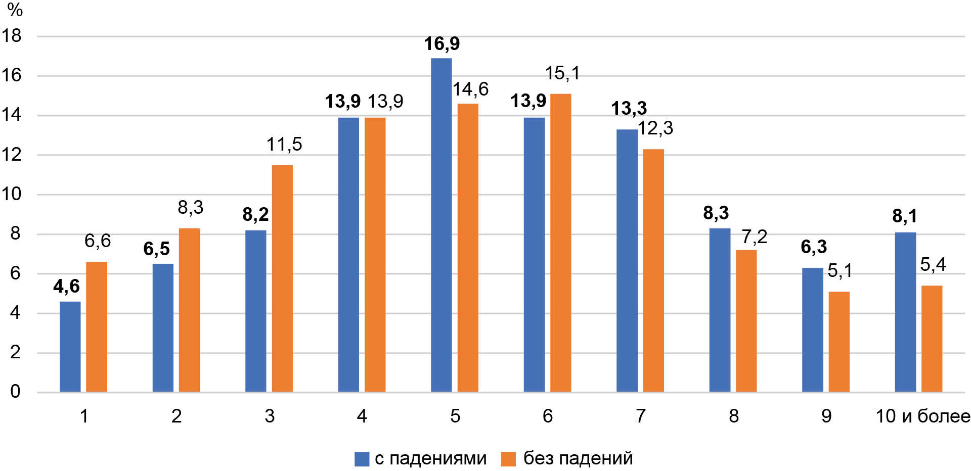 Ряд исследований указывают на повышение риска падений при приеме 5 и более лекарственных средств [19, 20], тогда как в других публикациях авторы сообщают об отсутствии влияния полипрагмазии на возникновение падений после поправки на возраст, пол, сопутствующие заболевания [21].