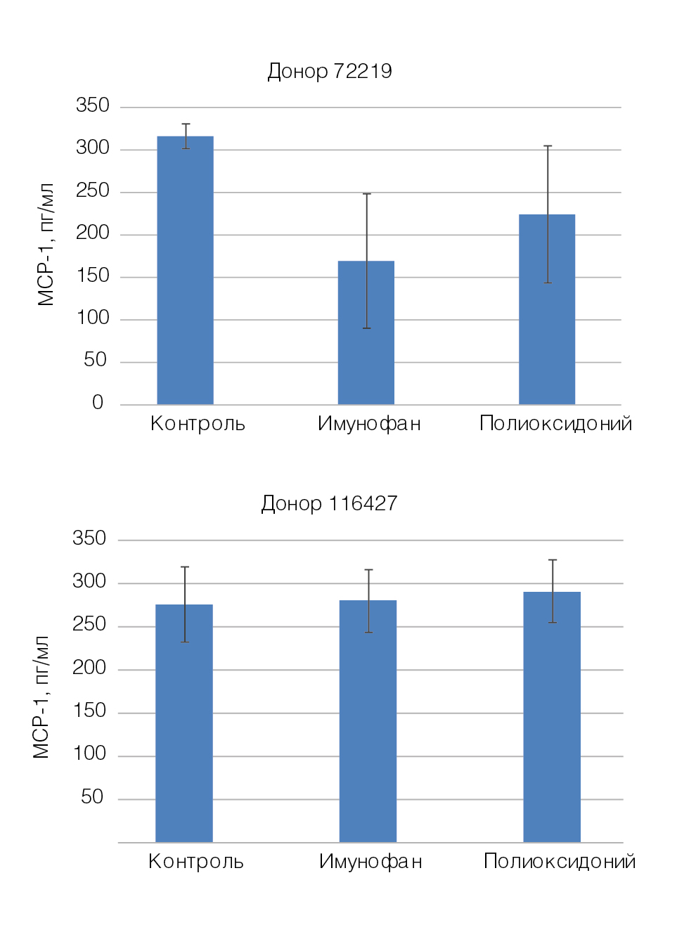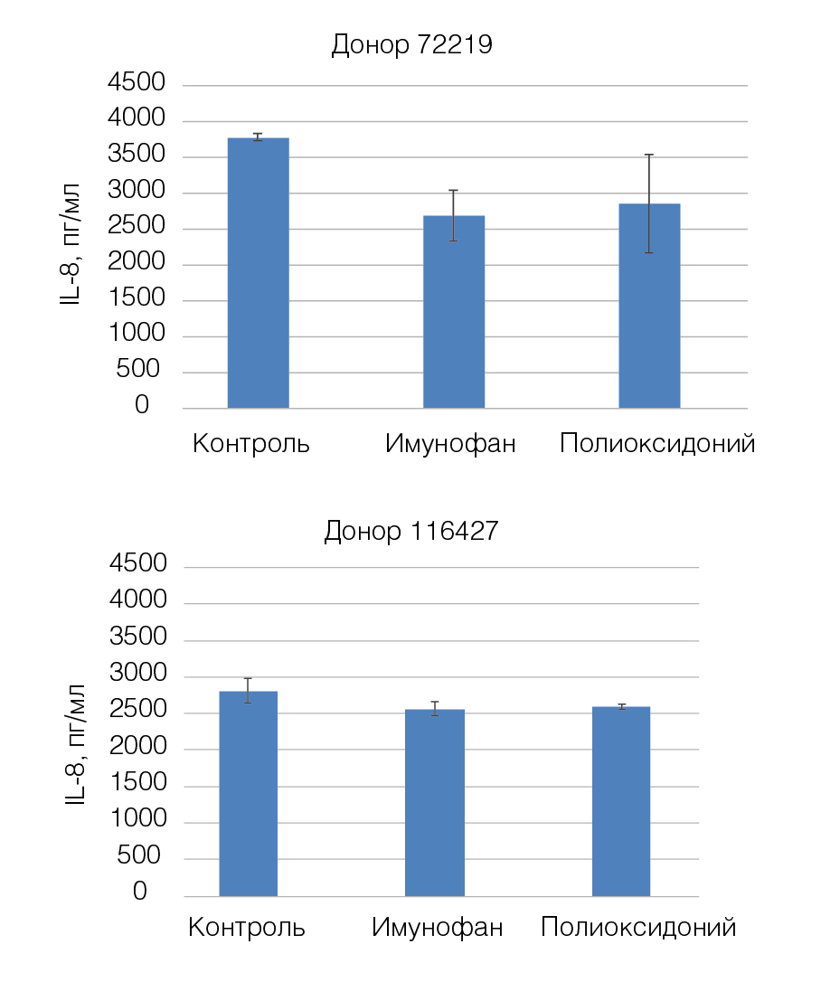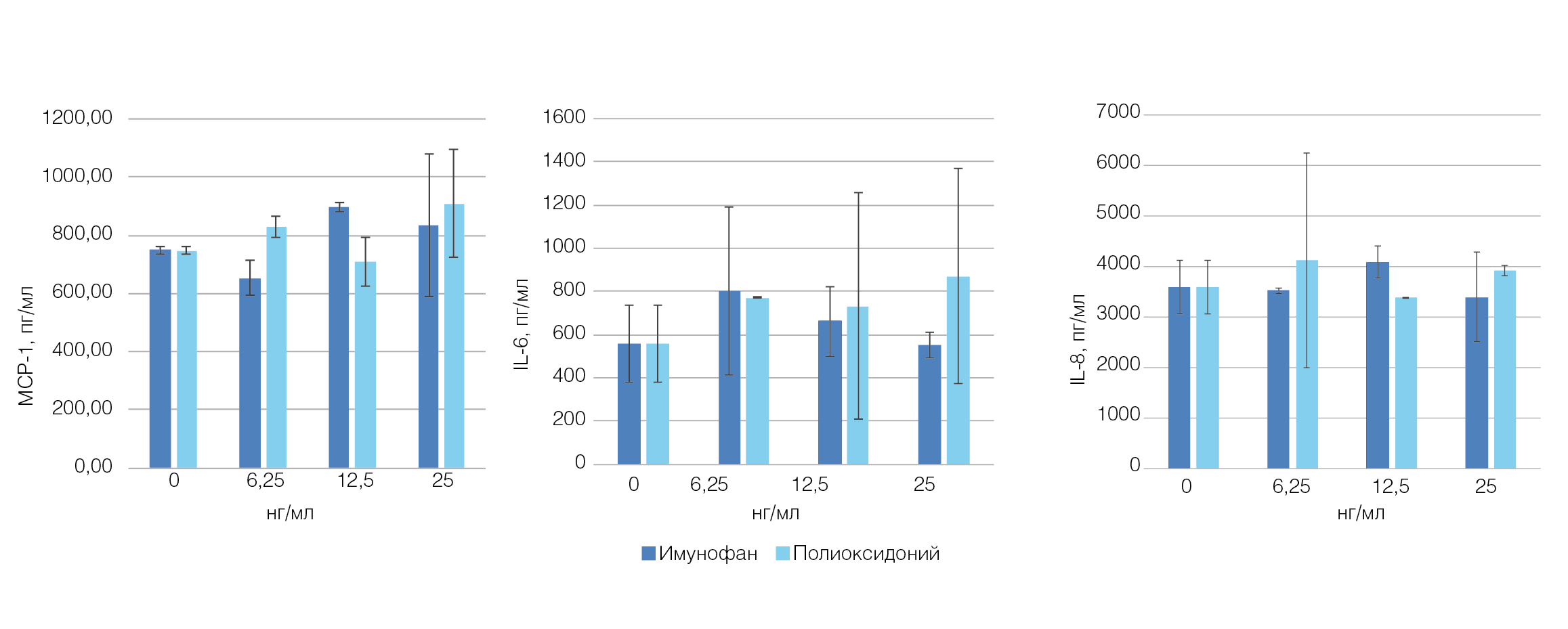 Material and methods. The peripheral blood mononuclear cells given by donors were cultured in vitro in the presence of immunomodulators Imunofan and Polyoxidonium. After incubation, the enzyme-linked immunosorbent assay (ELISA) of the culture medium for the presence of pro-inflammatory cytokines IL-6, IL-8/CXCL8, MCP-1/CCL2, and IFN-α cytokines was performed.