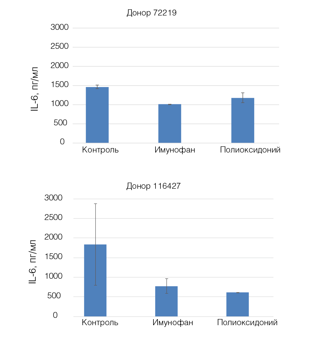 In series 2 and 3, PBMCs from individual donors were used. For each donor, two rows of wells were filled, with one well in each row. In the well of row 1, 100 μL of an extemporaneous solution of Polyoxidonium at a concentration of 200 ng/mL was added to the PBMC; 100 μL of an extemporaneous solution of Imunofan at a concentration of 200 ng/mL was added in the well of row 2. The final content of immunomodulators in the wells was 100 ng/well.