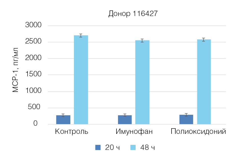 Рисунок 5. Сравнение продукции МСР-1 в питательную среду РВМС-клетками донора №116427 с инкубацией в присутствии иммуномодуляторов в течение 20 и 48 часов