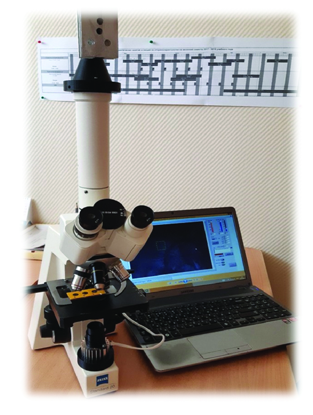 Image registration was performed in transmitted light using a Zeiss microscope and a Zeiss 100/1.25 field lens with a numerical aperture and oil immersion. The light source is a 1 W green light-emitting diode installed in an illuminator with a plastic collector lens. The illuminator is placed under the stage of the microscope in such a way that the image of the light-emitting diode is projected using the collector lens into the plane of the iris aperture diaphragm of the microscope’s achromatic condenser. The maximum numerical aperture of the condenser (at fully open diaphragm) is 0.65. A photograph of the apparatus is presented in Figure 1.