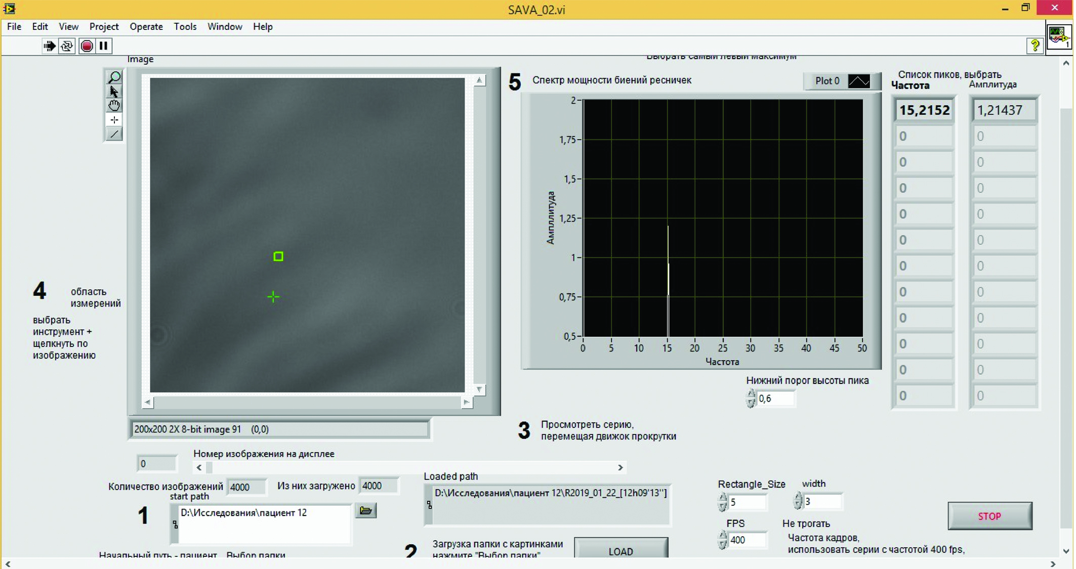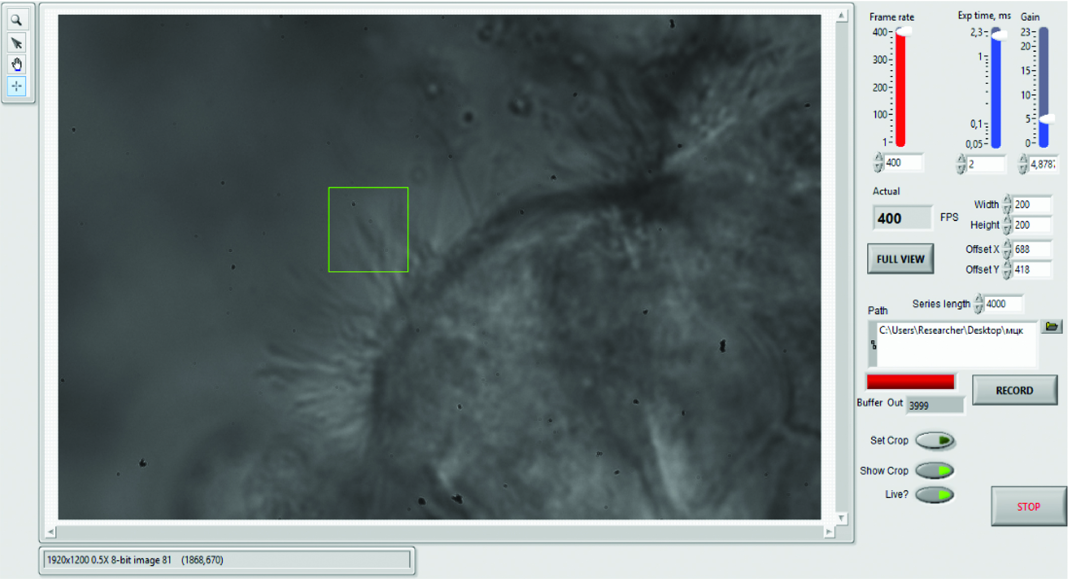 The image of ciliated epithelial cells was recorded using a digital complementary metal oxide semiconductor camera acA 1920–155um (Basler, Germany) with a maximum image resolution of 1920 × 1200 pixels at a frame rate of 164 frames per second. The size of one pixel corresponds to 5.86 × 5.86 microns in the object plane of the microscope. The camera was controlled using a software developed in the LabVIEW environment. To measure the ciliary action frequency, the image size was reduced to 200 × 200 pixels. Also, the frame rate was increased to 400 frames per second.