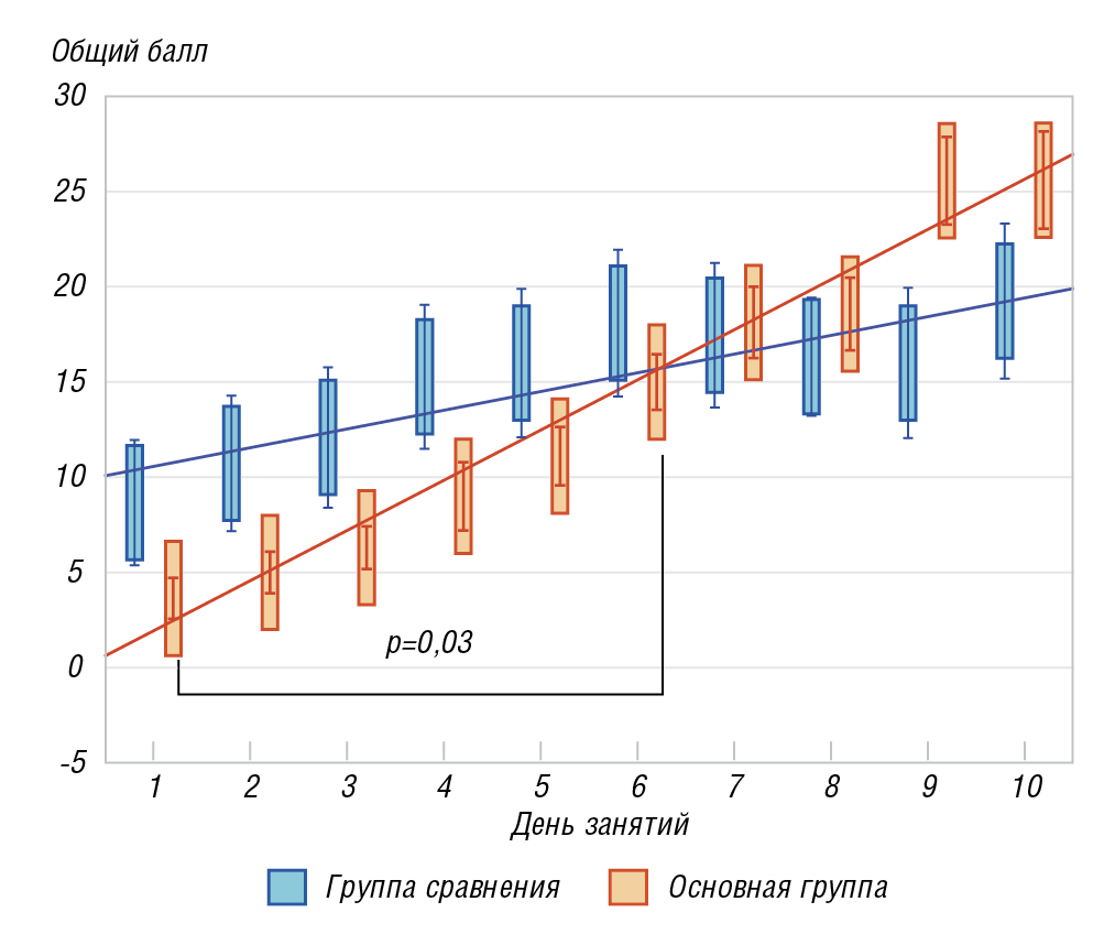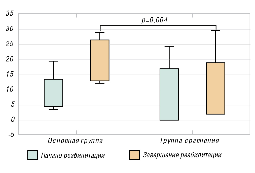 Среднее значение увеличения балла шкалы Берга на протяжении исследования в основной группе составило 7 (95% ДИ 2–11) баллов (р < 0,05), что находилось практически на уровне минимальной чувствительности данной шкалы (7–8 баллов). В основной группе динамика составила 19 (95% ДИ 12–27) баллов (р=0,004) (рисунок 1).