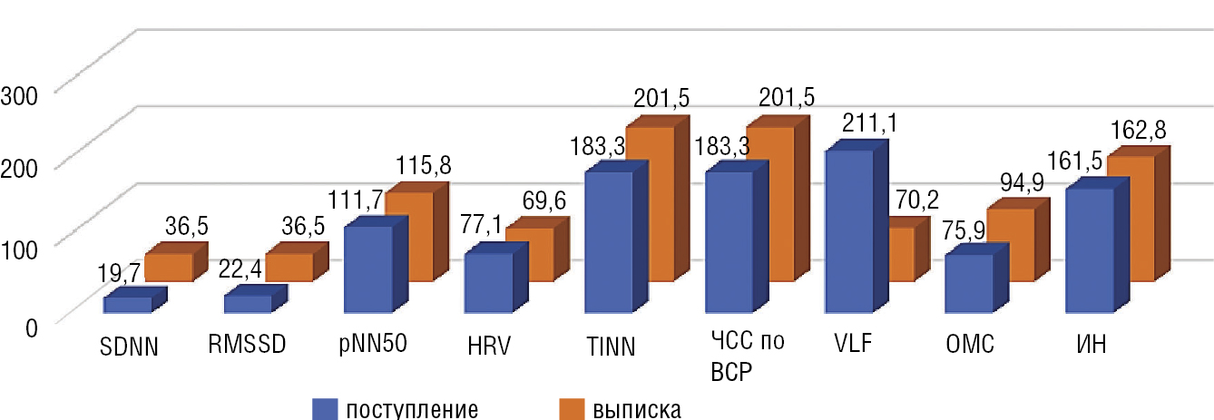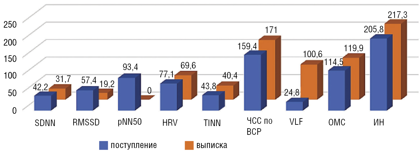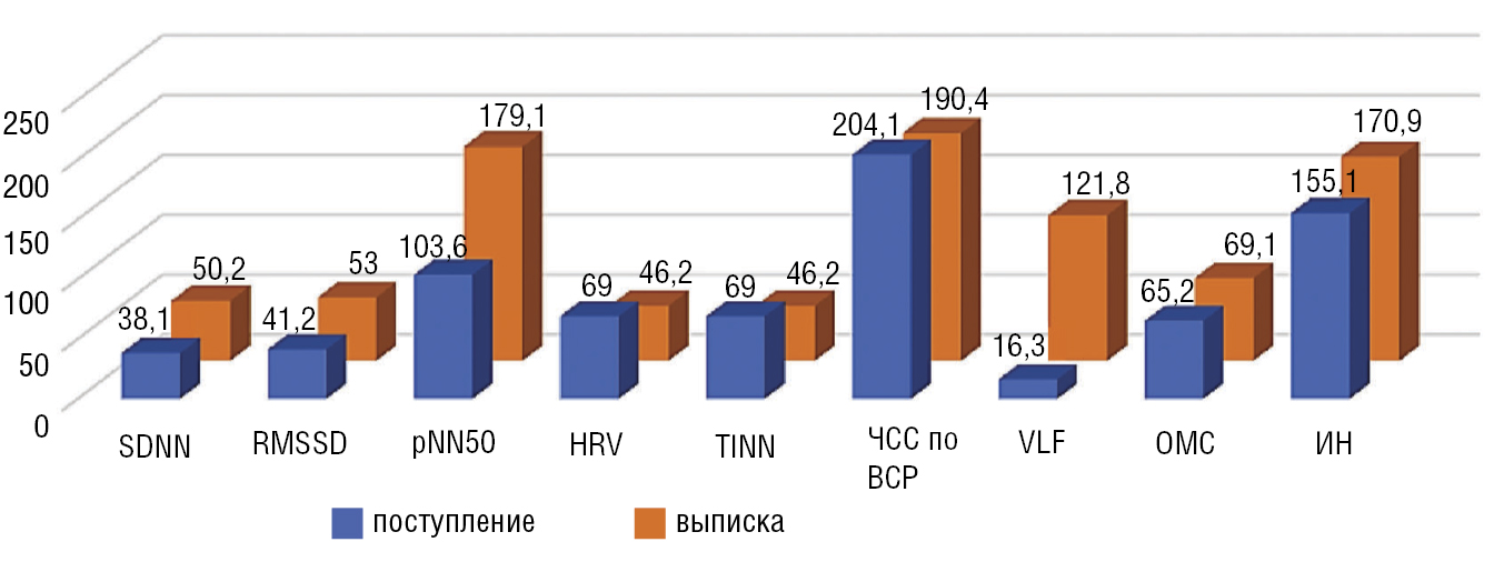 В основе влияния вегетативной составляющей при поступлении самые высокие значения VLF (Рi – 211.1) и ИН (Рi – 161,5) были у больных с бактериальной инфекцией; ИН (Рi – 155.1) – с вирусной инфекцией и микст-инфекцией.